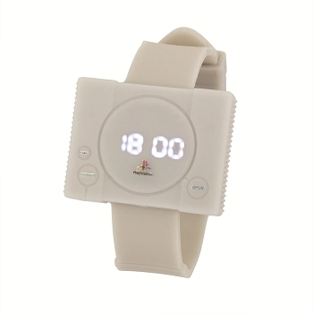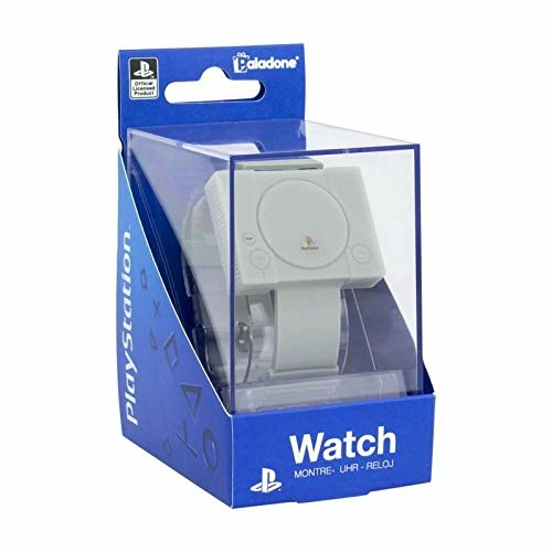 Le contrôleur PlayStation, avec sa forme distinctive et ses symboles de boutons emblématiques représentant un triangle vert, un x bleu, un cercle rouge et un carré rose, est désormais pratiquement synonyme de jeu sur console. La PlayStation Watch est un produit PlayStation sous licence officielle.