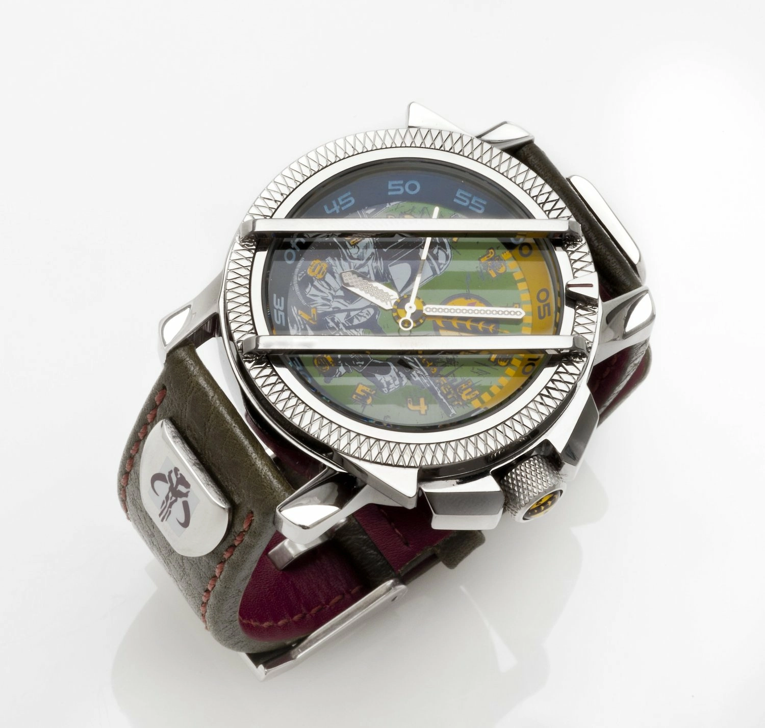 Cette magnifique montre Boba Fett est décorée avec un visuel du célèbre chasseur de primes sur un fond vert et jaune rappelant les couleurs de son armure.