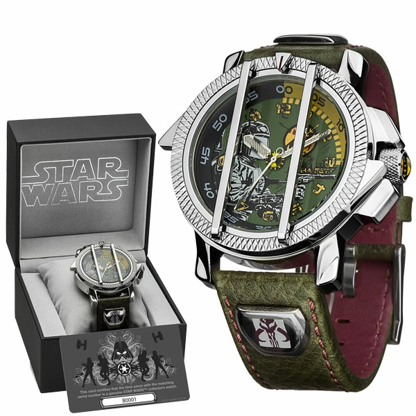 Cette montre de Boba Fett haut de gamme en édition limitée est un must have pour tout amateur de Star Wars. (Petit détail sympathique : Le bracelet en cuir affiche le symbole des Mandaloriens auquel appartient Boba Fett. Le verre du boîtier est protégé par un cadran rotatif en acier.)