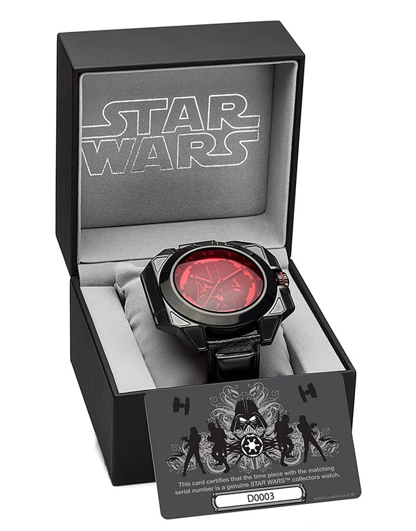 Cette montre de Dark Vador haut de gamme en édition limitée est un must have pour tout amateur de Star Wars. (Petit détail sympathique : le symbole de l'Empire décore le remontoir.)