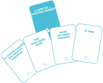 Afin de désigner le Phoquer, prenez la personne au QI le plus bas du groupe. Sa mission : distribuer 6 cartes réponses (blanches) à chaque joueur, piocher une carte Phrase à compléter (bleue), la lire à voix haute, attendre les propositions des autres joueurs et décider du gagnant.