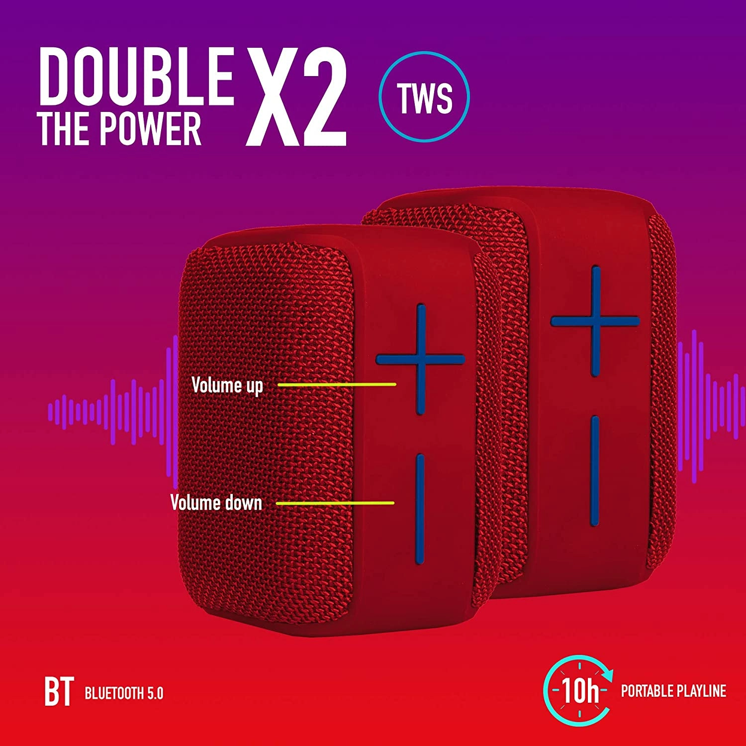 - L'enceinte est équipée d'une batterie rechargeable de 1200 MaH qui vous offre jusqu’ à 10 heures d'autonomie et 6 heures à volume maximum, 8 heures à 70% et 10 heures à 50%.