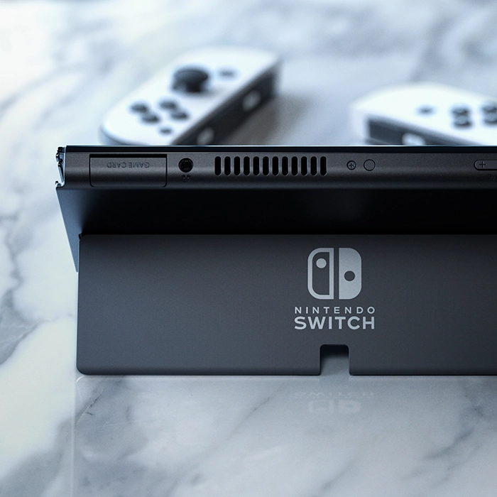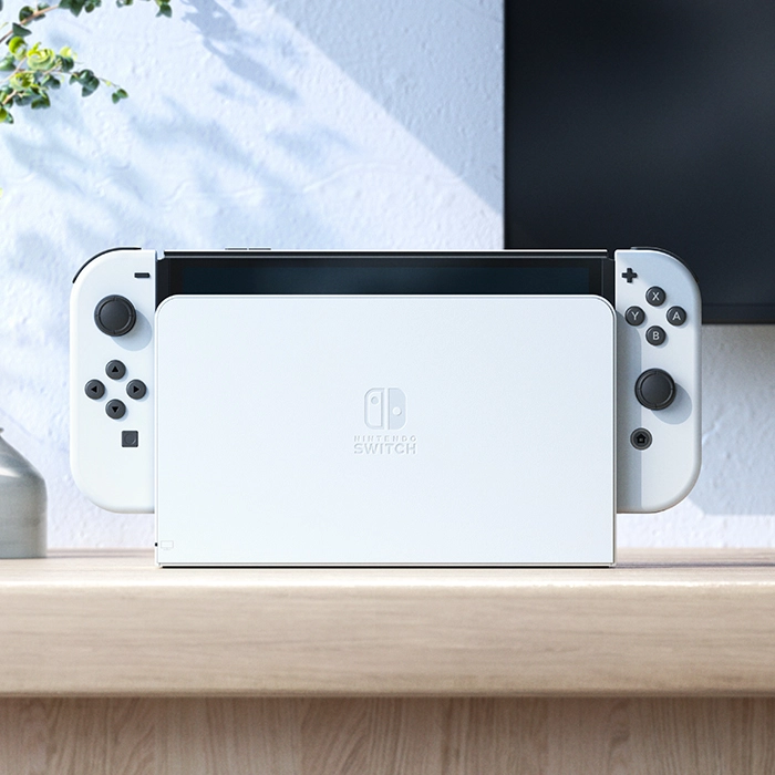 La station d'accueil incluse avec la Nintendo Switch (modèle OLED) comporte deux ports USB, un port HDMI pour connecter la station à un téléviseur ainsi qu'un nouveau port Ethernet pour une connexion plus stable lors du jeu en ligne en mode téléviseur.