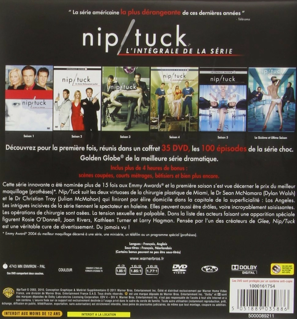 Découvrez pour la première fois, réunis dans un coffret 35 DVD, les 100 épisodes de la série choc Nip/Tuck. Golden Globe de la meilleure série dramatique. Inclus 4 heures de bonus : scènes coupées, courts métrages, bêtisiers et plus encore.