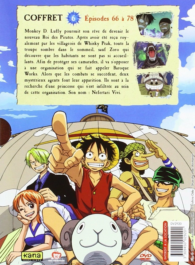 Episodes 66 à 78 - Oyez ! Oyez ! Pirates de tout bords ! Gold Roger, le légendaire Roi des Pirates, mort sur l'échafaud, a laissé derrière lui un trésor inéstimable : le "One Piece". Monkey D. Luffy, un garçon naïf et impulsif, rêve de mettre la main sur ce fameux butin et de devenir ainsi le nouveau Roi des Pirates.