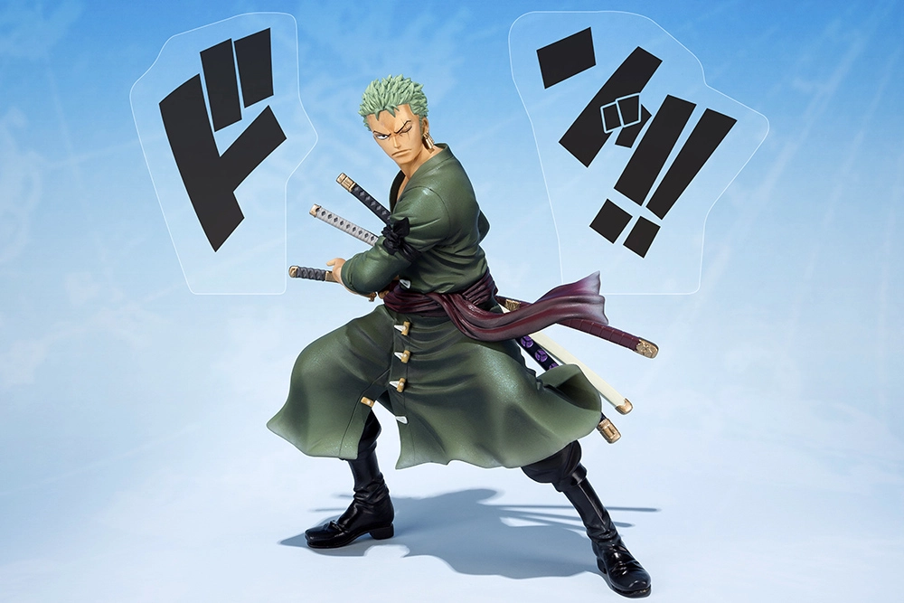 Voici le nouveau venu de la nouvelle gamme Figuarts Zero 5th Anniversary de One Piece. Comme toujours dans cette gamme, un grand niveau de détails, des parties transparentes pour plus de réalisme et des effets visuels « dododon » dans le fond pour donner un style manga. Zoro est aussi vendu avec un socle ainsi que ses 3 katanas.