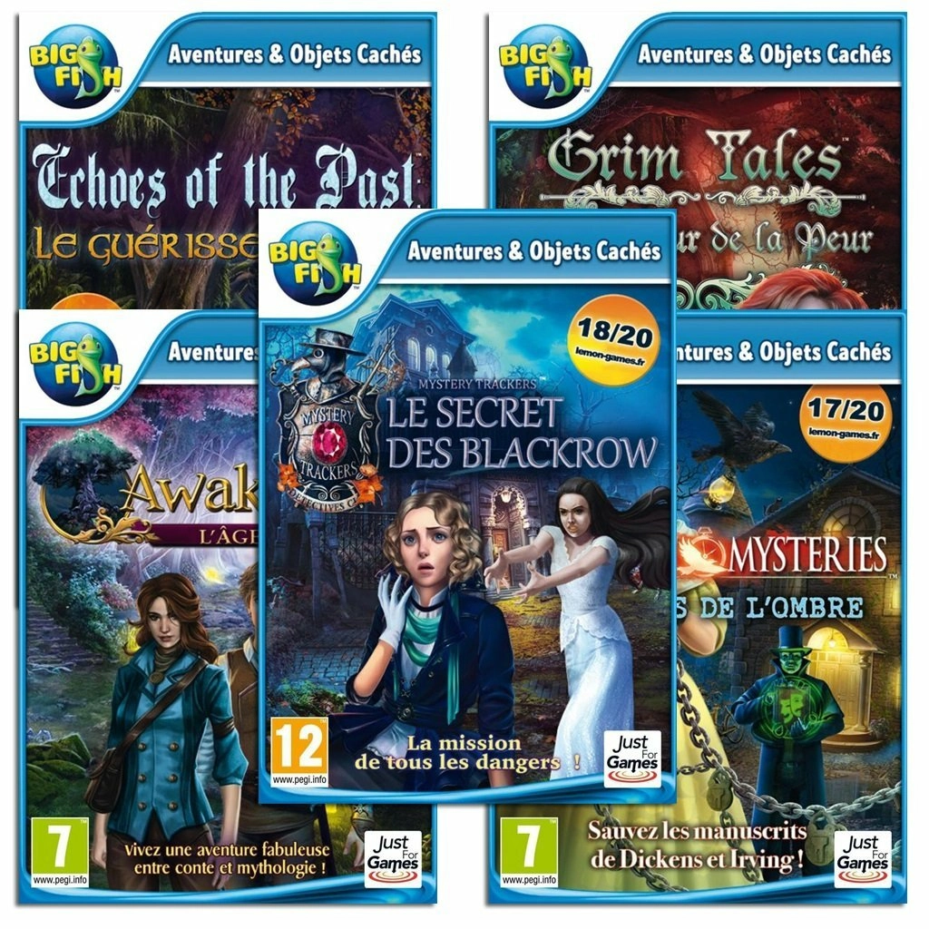Pour la seconde fois, ce Pack regroupe 5 jeux sur PC Big Fish livrés séparément : Awakening l'Age d'or, Mystery Trackers (7) Le Secret des Blackrow, Grim Tales (7) La Couleur de la Peur, Echoes of the Past (6) Le Guérisseur-Loup et Midnight Mysteries (6) Ecrivains de l'Ombre.