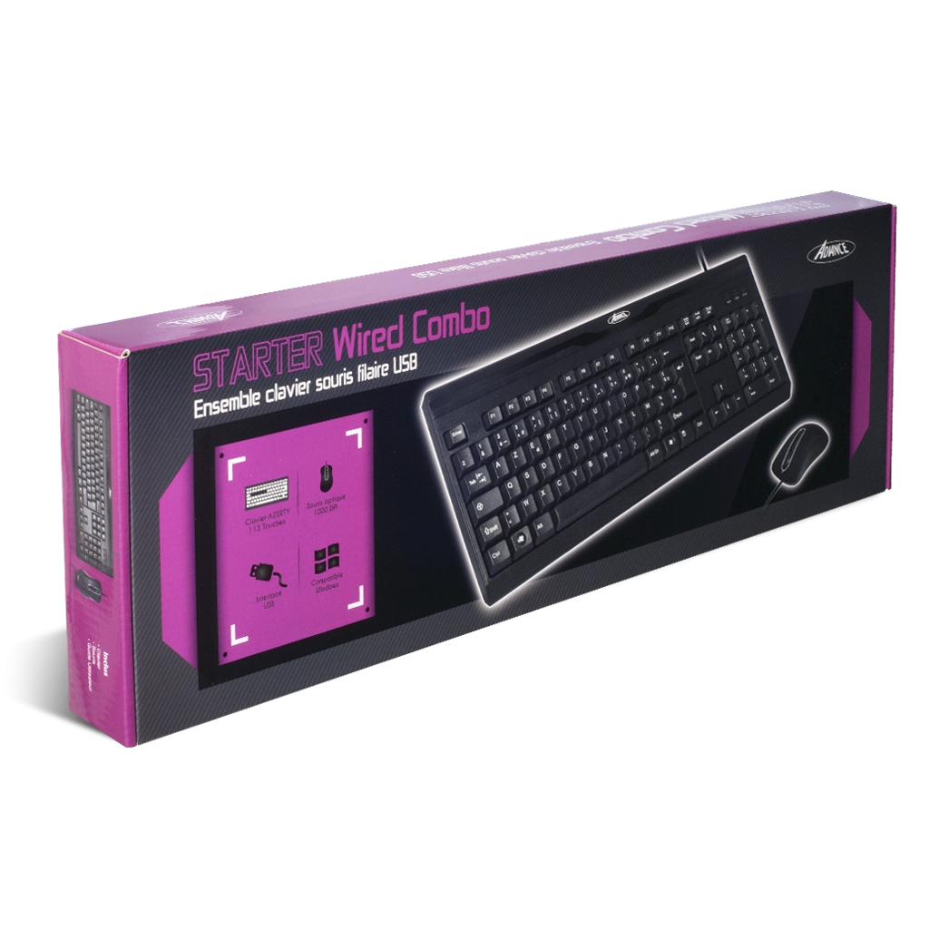 - Clavier filaire AZERTY, USB 1,4m, dim : 44,5x16x2,6cm, poids: 570g - Souris gamer filaire USB 1,5m, 1000 DPI, optique infrarouge - Systèmes d'exploitation supportés : Window XP / Windows Vista / Windows Seven / Windows 8 - Plug and Play