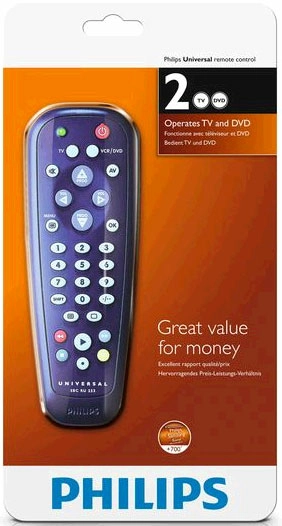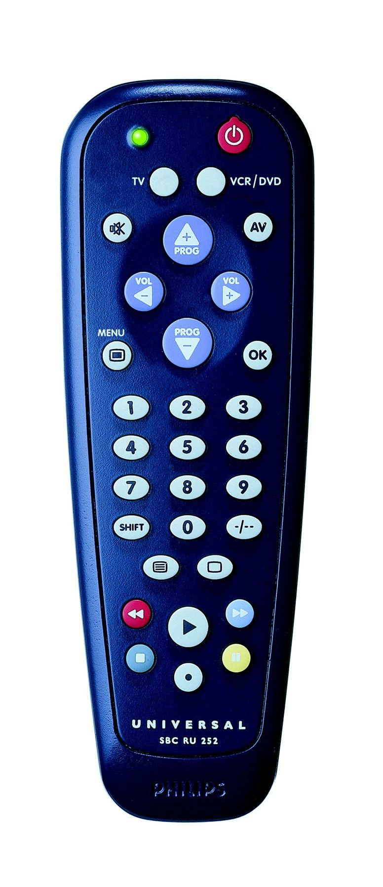 Télécommande universelle Philips SBCRU252 2 en 1 pour les fonctions élémentaires, compatible avec la plupart des marques de téléviseurs, magnétoscopes et lecteurs de DVD.