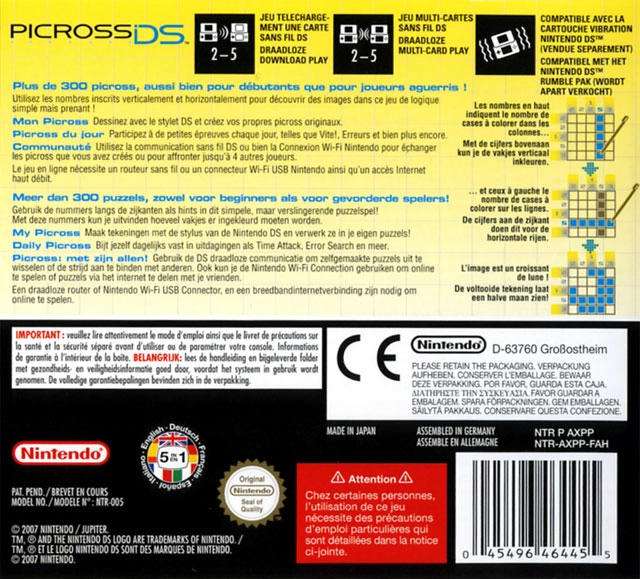 Le Picross débarque sur DS avec une version entièrement jouable au stylet. Le principe de ce jeu est le suivant : cochez les cases d'une grille de façon à faire apparaître une image.