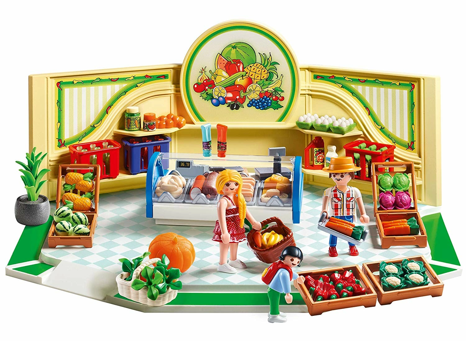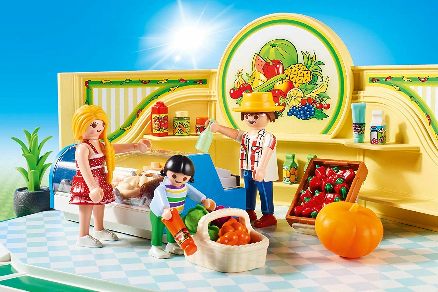C'est combien le kilo ? Demande la cliente à l'épicier. « Allez, je vous fais un prix comme vous m'avez aussi acheté des œufs » répond l’épicier. L'épicerie propose tout ce qu'il faut pour préparer le repas. Les cagettes pleines de fruits et légumes frais et la vitrine de la partie boucherie donnent des idées de bons petits plats aux clients. Peut être combiné aux références 9401 et 9402 pour créer un centre commercial. Avec présentoirs, fruits, légumes et autres produits frais.