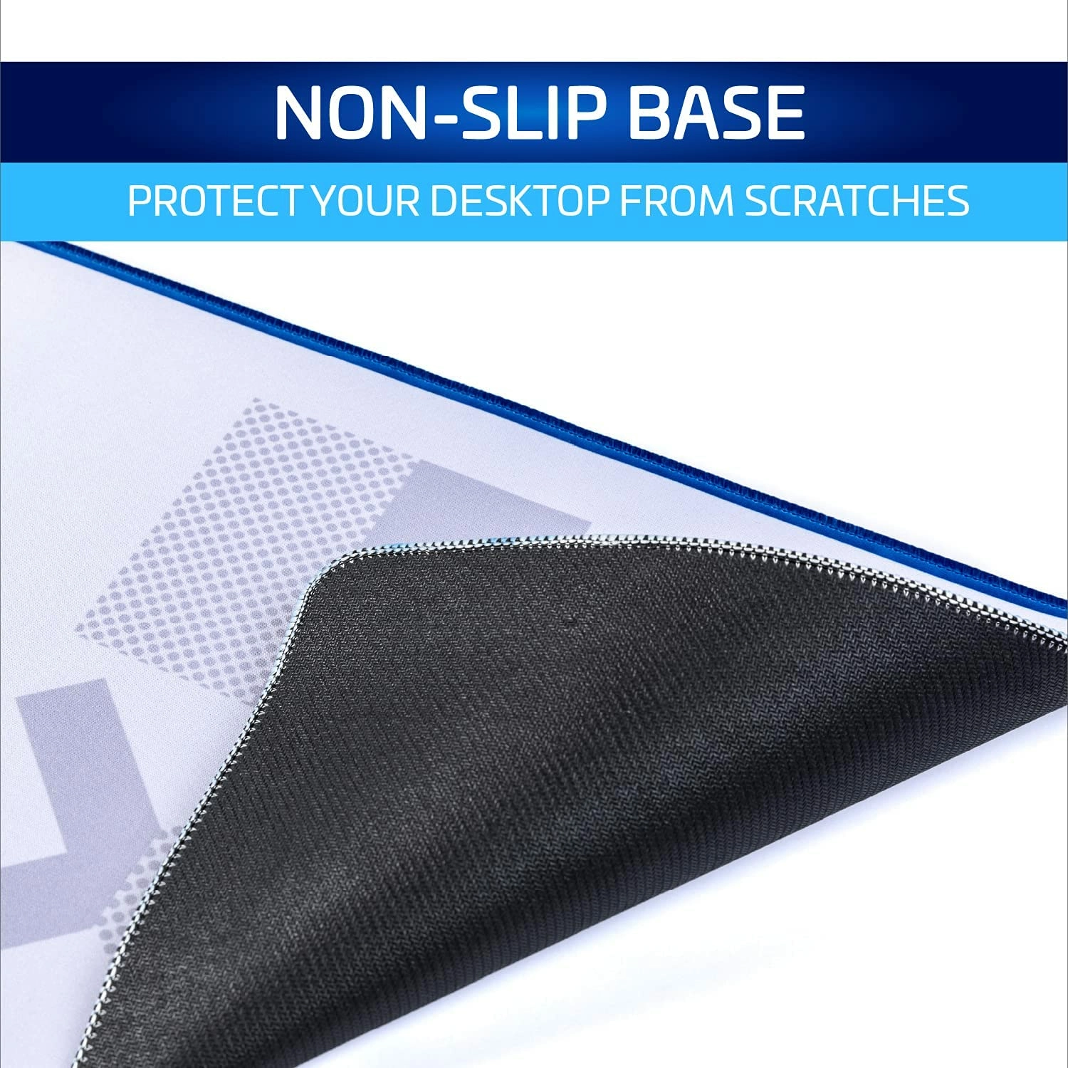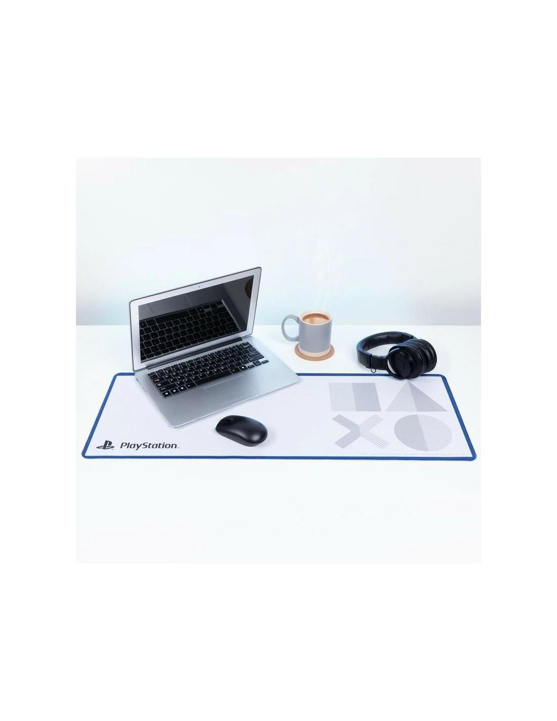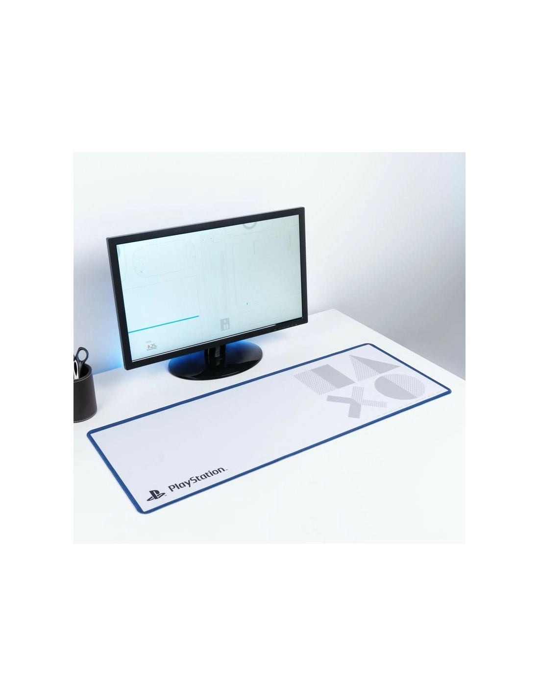 Mesurant 30 cm x 80 cm (12 « x 31 ») avec une surface lavable, le tapis de bureau blanc emblématique de la PlayStation 5e génération est décoré sur le côté droit avec les quatre symboles de bouton d’action (triangle, cercle, croix, carré) de couleur argent, le logo PlayStation apparaît dans le coin inférieur gauche en noir et une bordure bleue ajoute la touche finale