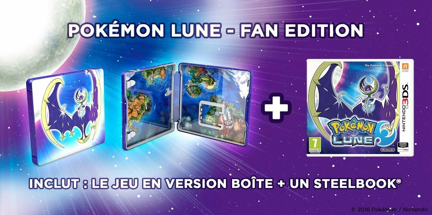 Pokemon Lune édition Steelbook contient le jeu Pokemon Lune + un Steelbook aux couleurs de Pokemon Lune.