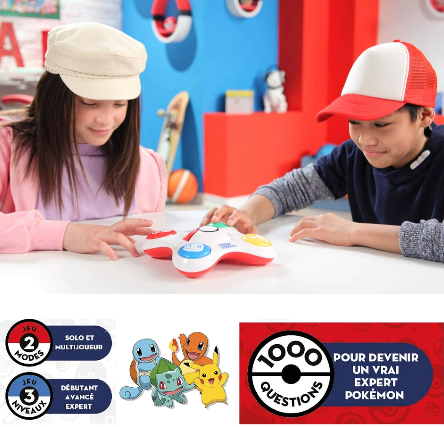 Vous êtes un fan invétéré de l'univers Pokémon, les pokémon n'ont plus aucun secret pour vous ? Ce jeu Dresseur Quiz interactif en français est fait pour vous ! 1 000 questions pour tester vos connaissances Pokémon ! Soyez le premier à buzzer, donnez la bonne réponse et remportez la partie !Le maître du jeu est l’objet électronique, il vous guidera dans le jeu pour des parties rythmées et rapides. La partie se joue en 2 manches, le maître du jeu fournit des informations sur l’univers Pokémon, et c’est à vous de démêler le Vrai du Faux ! Si vous donnez la bonne réponse vos adversaires perdent 2 points à l’inverse c’est vous qui en perdez 2 ! Tous les joueurs commencent la partie avec 50 points. La partie est finie lorsque l’un des joueurs n’a plus de points et le joueur ayant accumulé le plus de point l’emporte !Age : partir de 6 ansNombre de joueurs : 1 à 4Durée : 15 à 20 minutesContenu : un vrai ou faux électronique, une notice, 3 piles R03 / AAA.Avertissement De SûretéNe convient pas aux enfants de moins de 36 mois. Contient de petits éléments susceptibles d'être avalés.