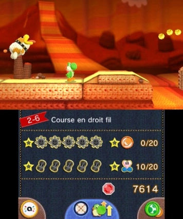 Défaites un mur d'un coup de langue de Yoshi, lancez des pelotes de laine pour tricoter de nouvelles plateformes et faites un saut plané pour atteindre des endroits surélevés. En utilisant des badges de puissance ou l'amiibo Poochy de laine (vendu séparément ou dans un pack logiciel), vous pouvez demander à Poochy de venir vous donner un coup de patte à tout moment !