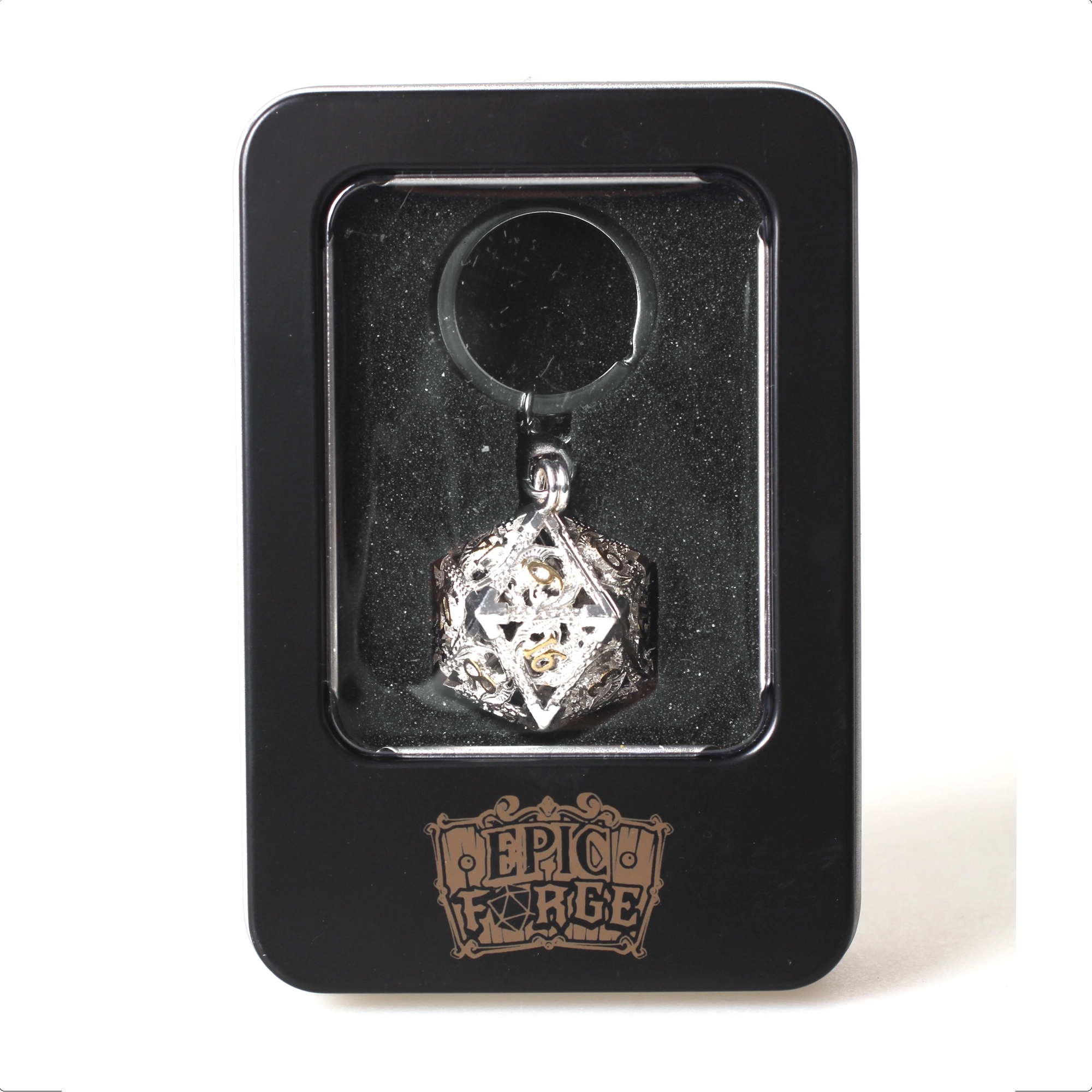 Découvrez Porte clé- d20 argenté - avec lot de 7 mini dés métal 5mm dans boite métal sur Référence Gaming.