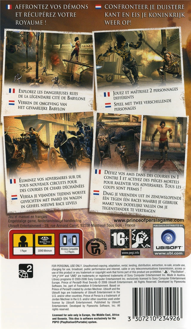 Prince of Persia Rival Swords est un jeu d'action/aventure sur PSP. Vous y incarnez le fameux Prince de Perse, un héros déchiré par ses démons intérieurs, à tel point qu'il est lui-même son pire ennemi.