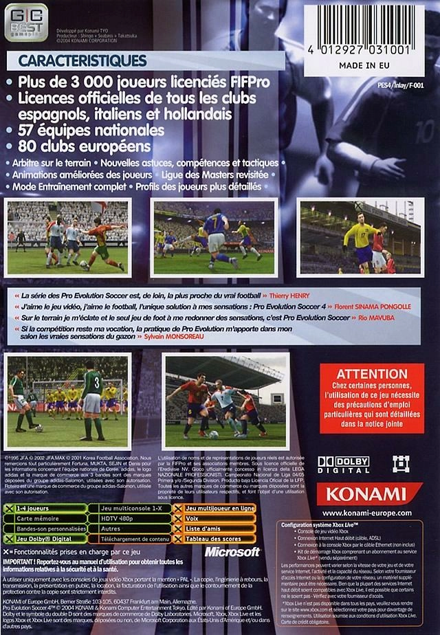 Pro Evolution Soccer 4 est un jeu de sport pour Xbox. Retrouvez toute l'ambiance des matches de foot sur votre Xbox en prenant le contrôle de l'équipe choisie. Plus de 3000 joueurs licenciés FIFPro, 57 équipes nationales et 80 clubs européens sont présents. Affrontez l'IA du jeu ou jouez avec vos amis à côté de vous pour des parties enflammées.