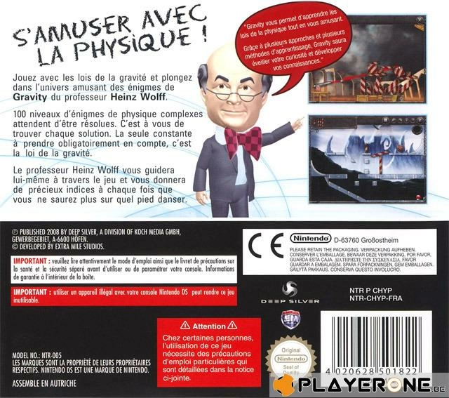 Professor Heinz Wolff's Gravity sur DS est un puzzle-game qui va mettre votre logique à rude épreuve. Sélectionnez soigneusement les éléments dans le bon ordre pour mener une balle jusqu'à l'interrupteur en tenant compte des lois de la physique dans des niveaux de plus en plus difficiles. Il y en a 100 au total. Vous pourrez également vous mesurer à vos amis à tour de rôle dans 3 mini-jeux.