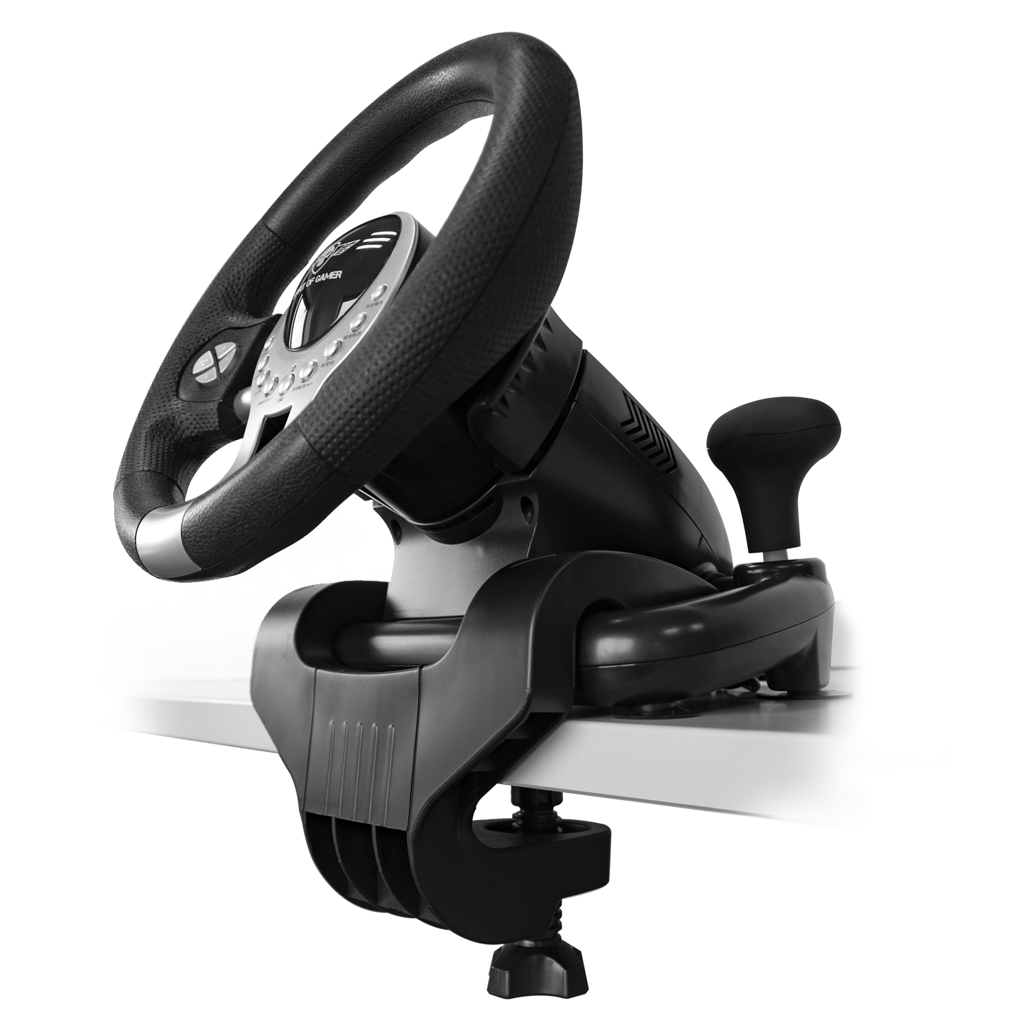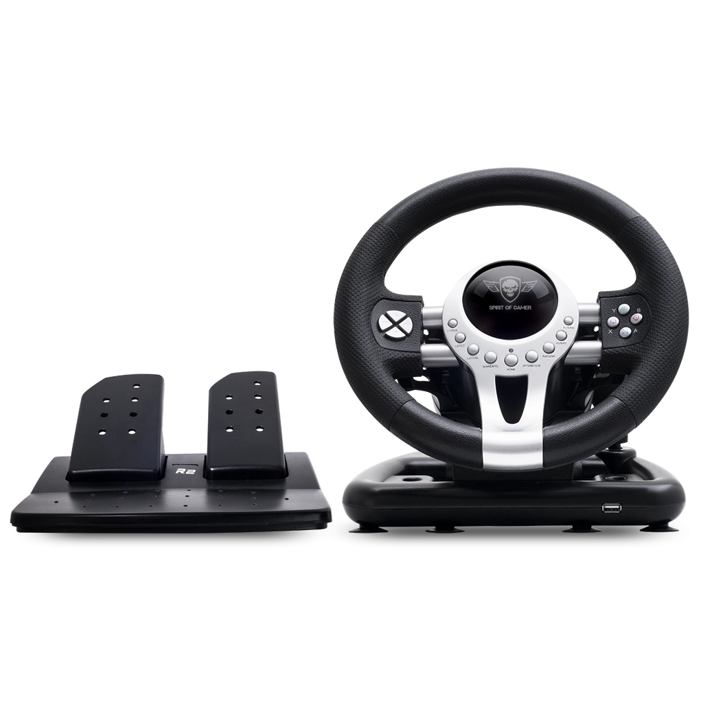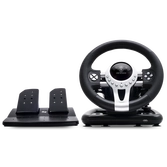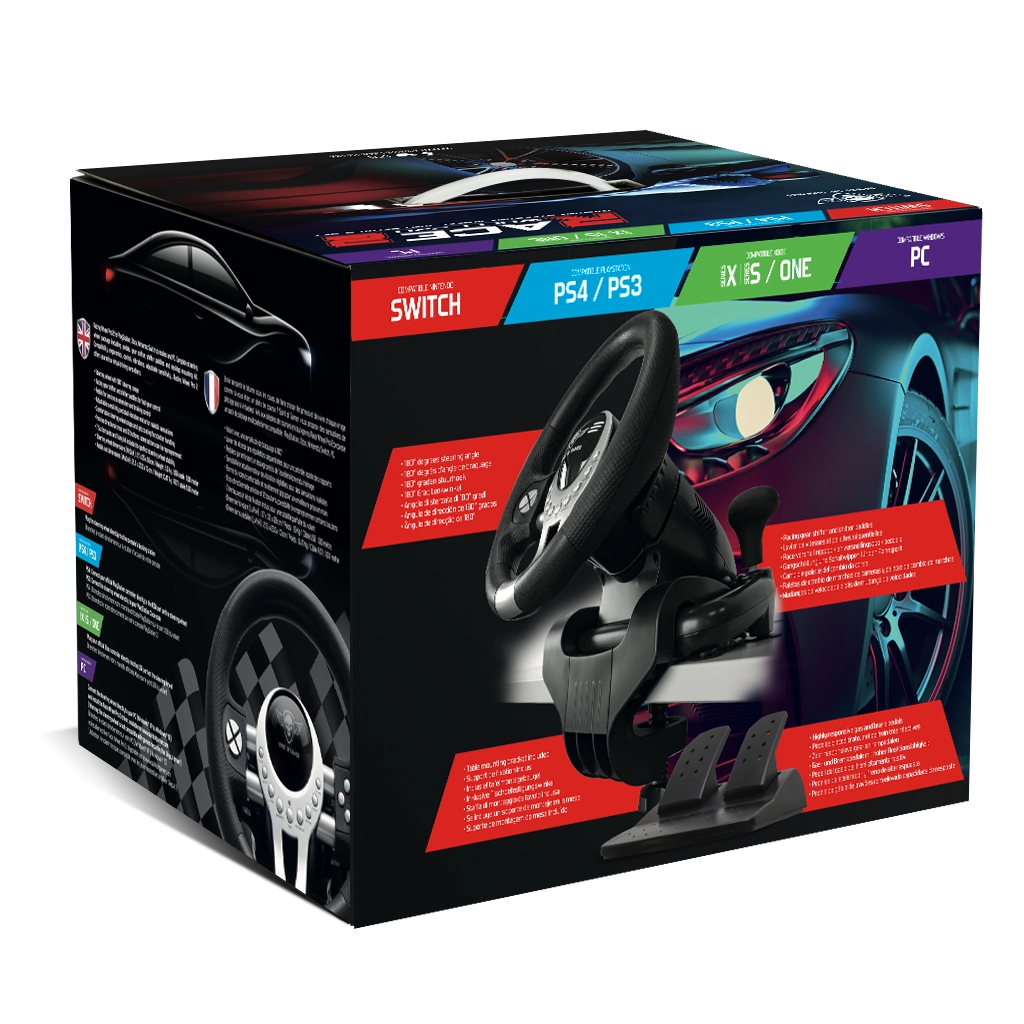 - Volant avec amplitude de braquage à 180°- Double moteur de vibration pour des sensations toujours plus réalistes- Revêtement Grip Control pour une prise en main racing- Levier de vitesse pro et palettes séquentielles pour un contrôle rapide des rapports- Pédalier double à ressort pour un dosage progressif de l&rsquoaccélération et un freinage ultra précis- Croix octodirectionnelle analogique ultra précise- Bouton Home pour accéder directement aux paramètres PS4 /PS3 / Xbox One- 8 Boutons analogiques- 4 Boutons numériques: Options / Share /&hellip- 8 boutons programmables grâce à une mémoire intégrée: Palettes séquentielles, Levier de vitesse, Pédalier&hellip- Réglage de la sensibilité et des effets de vibration- Volant équipé de 7 ventouses pour une parfaite adhérence- Longueur des câbles: volant 1.80 mètre / pédalier 1.60 m