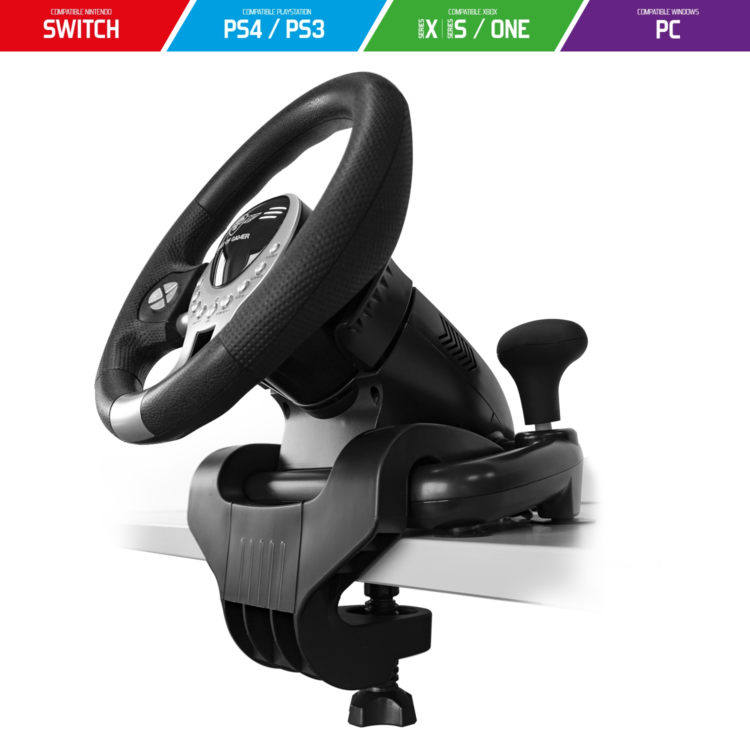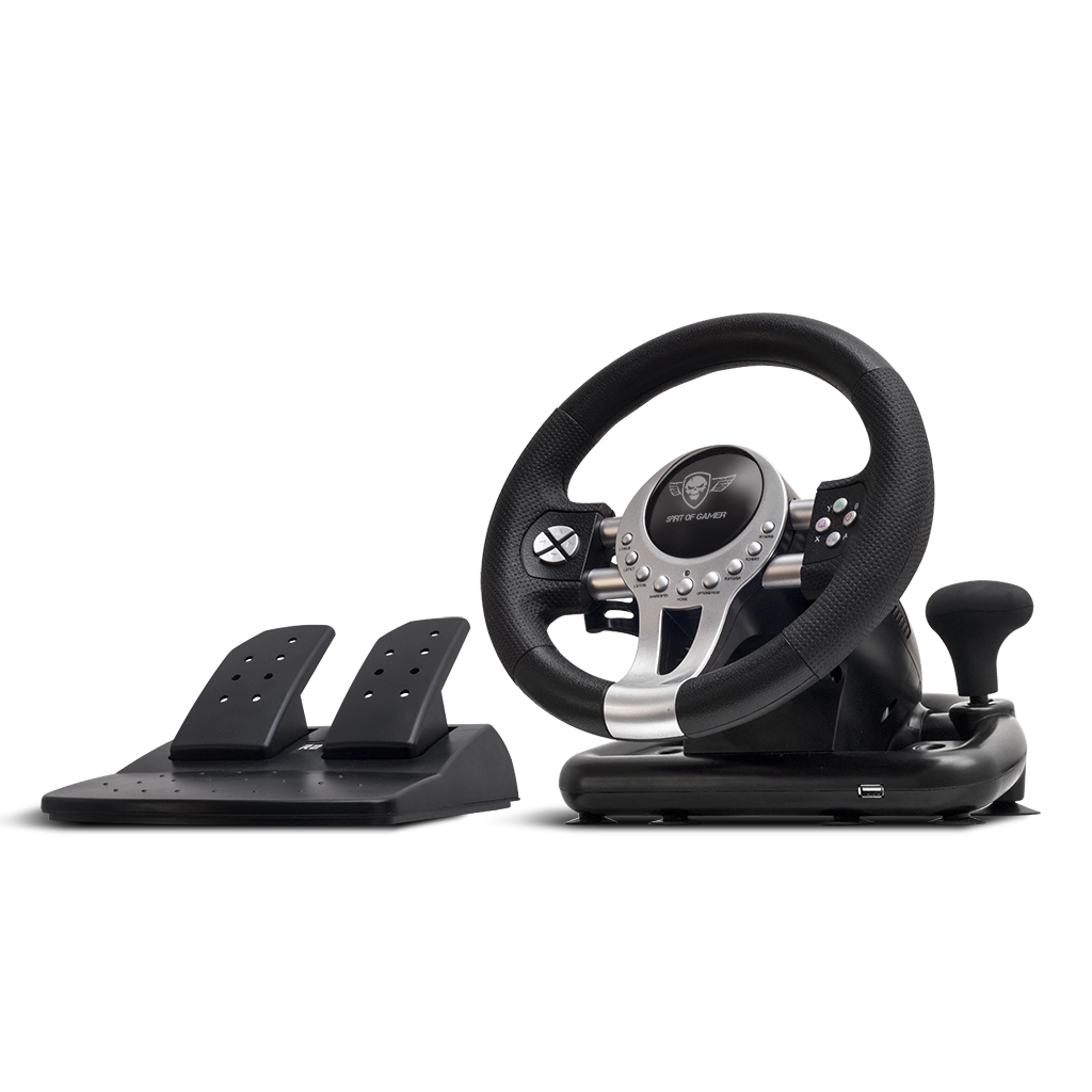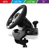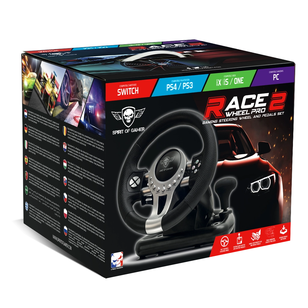 - Volant avec amplitude de braquage à 180°- Double moteur de vibration pour des sensations toujours plus réalistes- Revêtement Grip Control pour une prise en main racing- Levier de vitesse pro et palettes séquentielles pour un contrôle rapide des rapports- Pédalier double à ressort pour un dosage progressif de l&rsquoaccélération et un freinage ultra précis- Croix octodirectionnelle analogique ultra précise- Bouton Home pour accéder directement aux paramètres PS4 /PS3 / Xbox One- 8 Boutons analogiques- 4 Boutons numériques: Options / Share /&hellip- 8 boutons programmables grâce à une mémoire intégrée: Palettes séquentielles, Levier de vitesse, Pédalier&hellip- Réglage de la sensibilité et des effets de vibration- Volant équipé de 7 ventouses pour une parfaite adhérence- Longueur des câbles: volant 1.80 mètre / pédalier 1.60 m