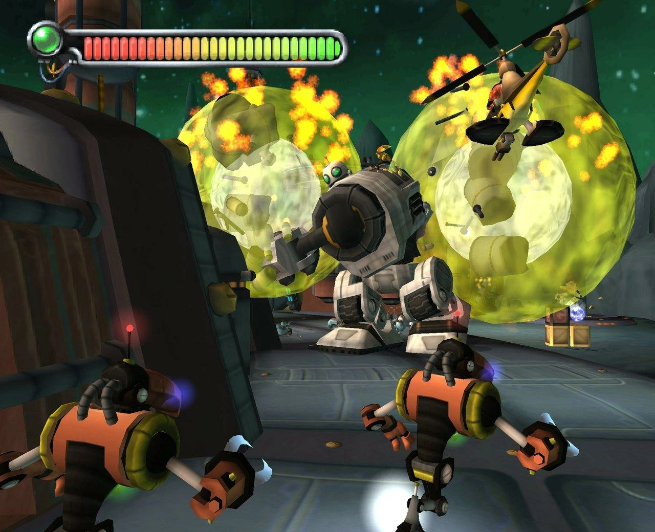 Le jeu de plates-formes Ratchet & Clank édition Platinum sur Playstation 2 met en scène Ratchet, un mécanicien hors pair, et Clank, un petit robot initialement conçu pour aider le Président Drek à imposer sa dictature au monde. A cause d'un défaut de fabrication Clank décide de ne pas aider son boss dans sa funeste entreprise et s'allie à Ratchet. De nombreux gadgets sont à votre disposition pour contrecarrer les plans diaboliques du président.