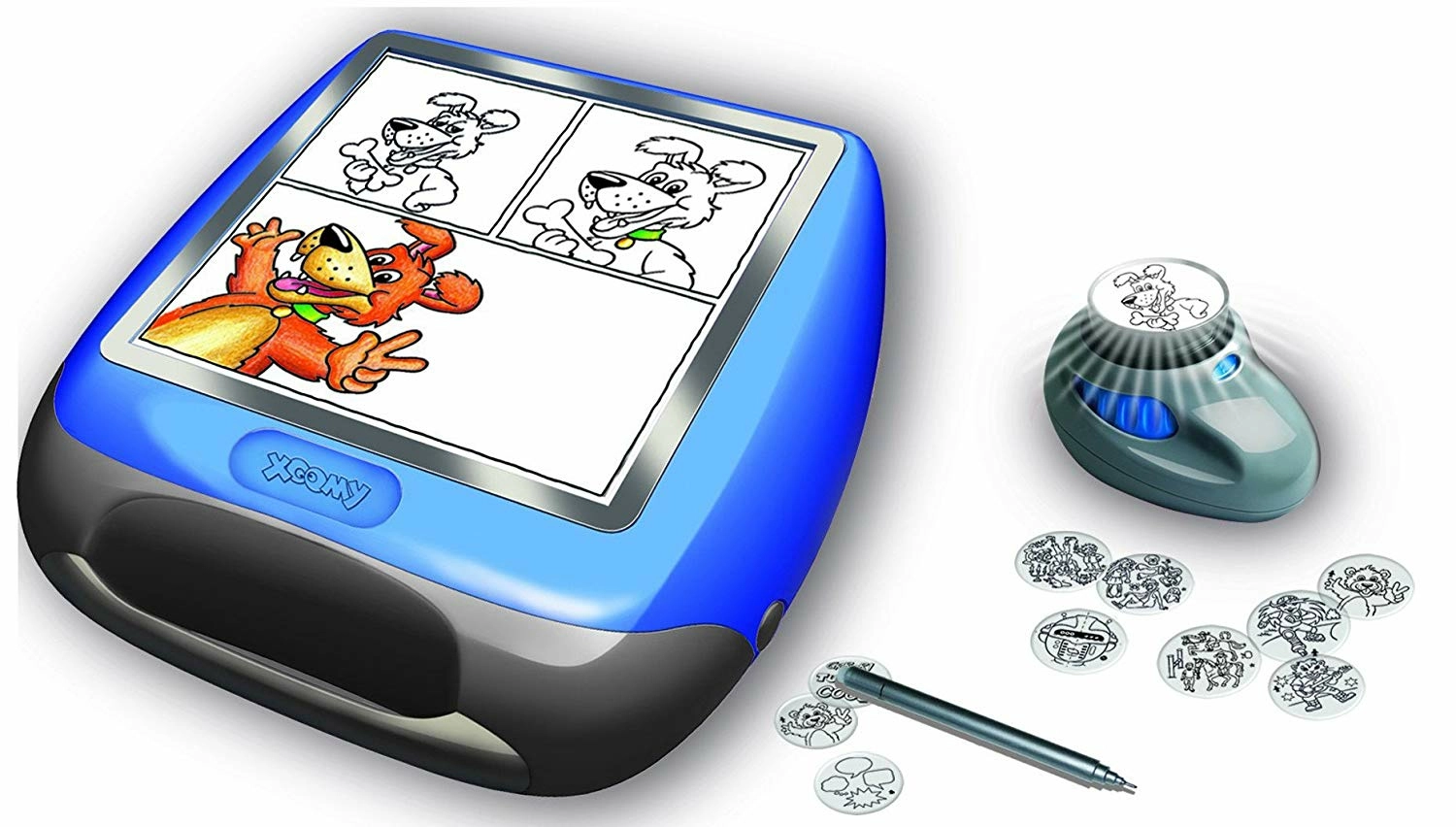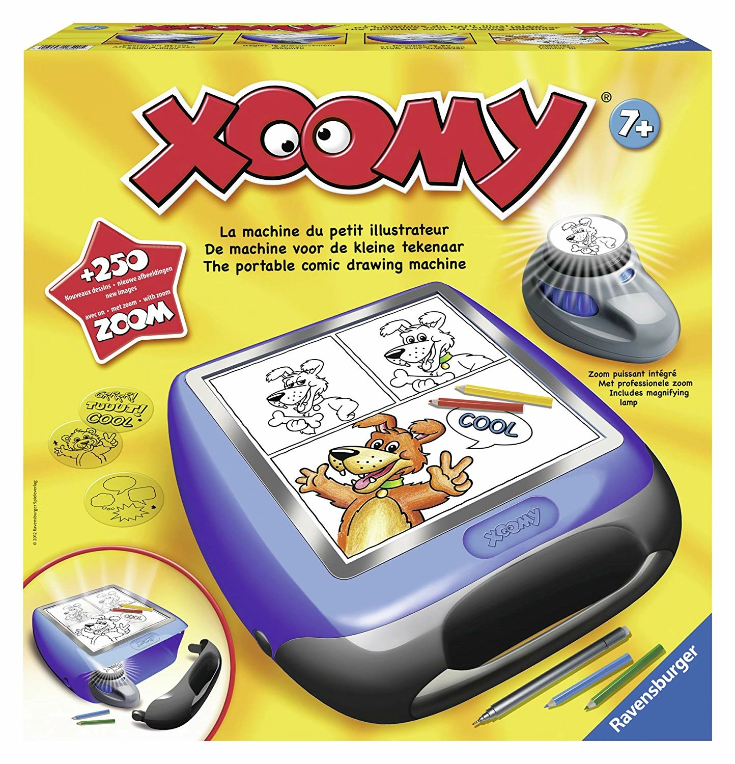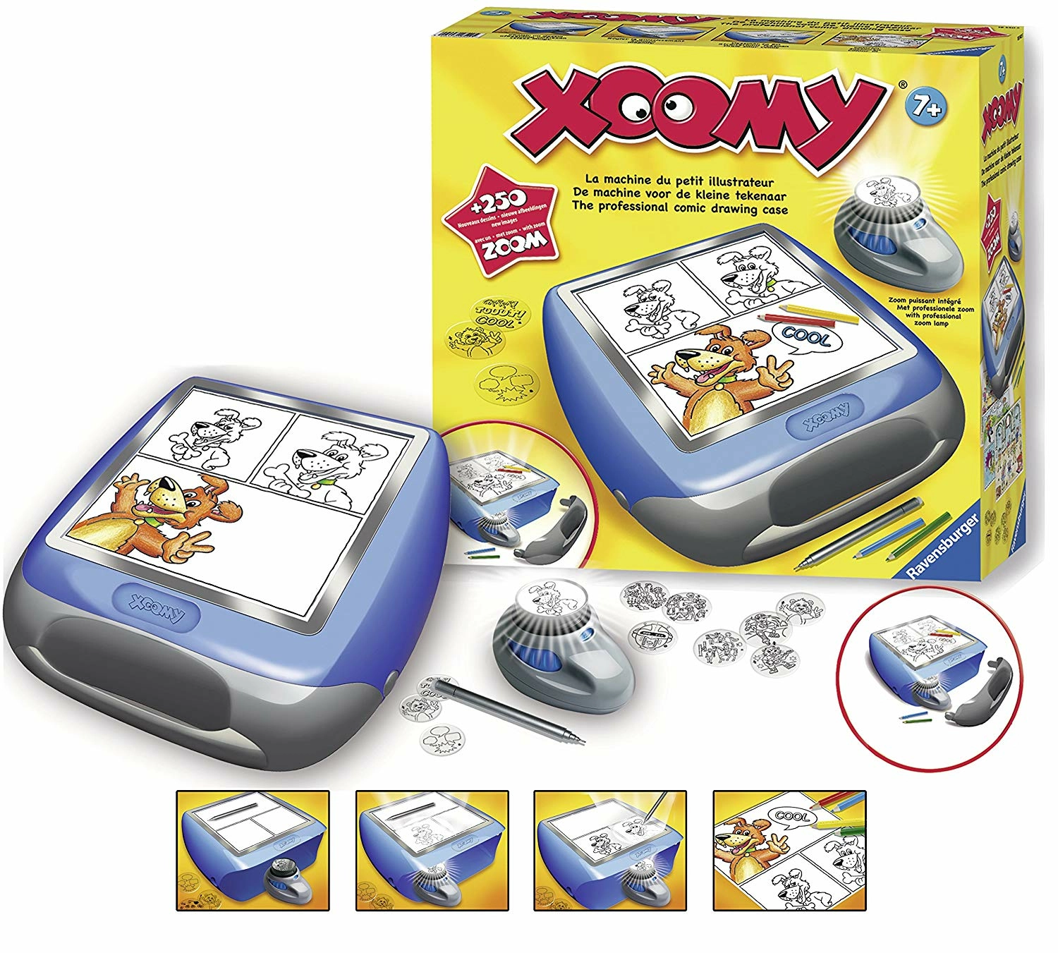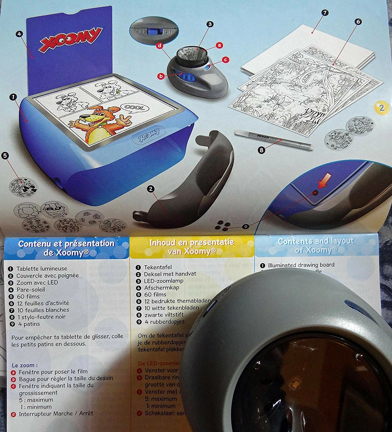 Le jeu Xoomy est une valisette de dessinateur avec tablette lumineuse. Le jeu possède un zoom puissant à LED, un pare soleil, 60 films, 12 feuilles d'activités, 10 feuilles blanches et 1 stylo feutre noir. 4LR6 non fournies.
