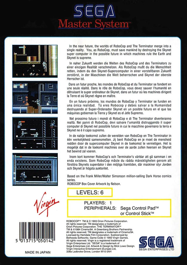 Robocop vs Terminator sur Mster System est un jeu d'action combinant les univers des deux longs métrages éponymes. L'histoire débute lorsque les soldats de John Connor découvrent que Skynet est issu de la technologie cybernétique utilisée pour fabriquer Robocop. Incarnez ce dernier, entrez dans la résistance et venez en aide à Connor pour sauver l'humanité des machines.