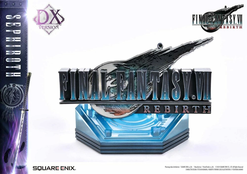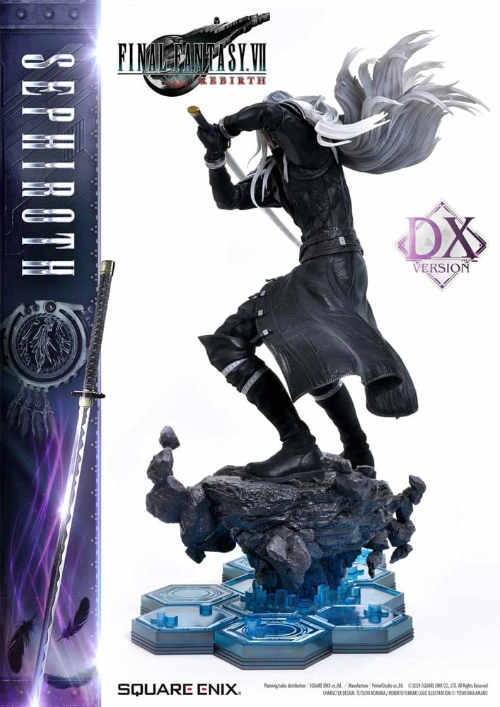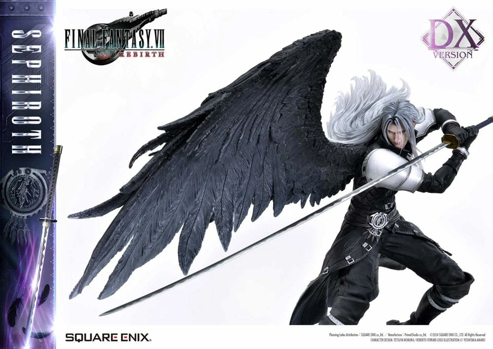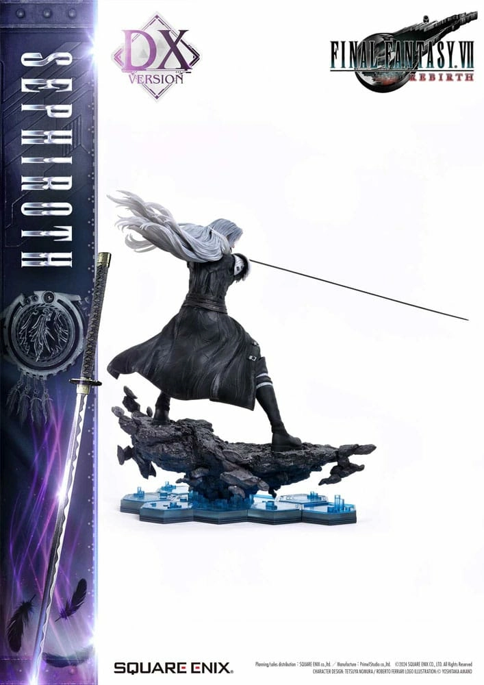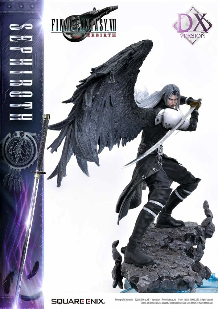 Une aile noire comme l'encre qui bat au milieu des étoiles, et une lame vengeresse qui annonce le désastre.Séphiroth, de FINAL FANTASY VII REBIRTH, débarque sous forme de statue 1/4 perfectionnée en 3D.SQUARE ENIX et Prime 1 Studio ont refait équipe pour vous offrir un nouveau modèle dans la série haut de gamme SQUARE ENIX Masterline. Séphiroth, l'ange à une aile de FINAL FANTASY VII REBIRTH, vient s'ajouter à cette collection qui a su capter l'attention des collectionneuses et collectionneurs du monde entier !Séphiroth brandit son épée allongée exactement comme vous le voyez lorsque vous l'affrontez dans le jeu. Fruit d'une analyse minutieuse de ses apparitions dans le jeu, cette statue au 1/4 représente parfaitement sa pose emblématique. La colorisation et la sculpture élaborées de la statue capturent Séphiroth dans ses moindres détails, de ses longs cheveux argentés qui flottent derrière lui à son aile noire comme l'encre qui sort de son épaule droite, en passant par ses yeux couleur mako troublés par la folie et par Masamune, et son superbe motif captivant.Vous retrouverez les hexagones bleus qui recouvrent le socle spécial de la statue sur celles de Cloud Strife et Zack Fair de la même série. Ainsi, vous pourrez les exposer côte à côte en toute harmonie.La version Deluxe inclut un torse supplémentaire sans aile, grâce auquel vous pourrez exposer Séphiroth dans toute sa gloire de SOLDAT 1re classe légendaire.La sculpture et la colorisation exquises de ce chef-d'oeuvre évoquent l'histoire sophistiquée du jeu. Séphiroth dominera votre collection de sa présence accablante !Composition : pierre artificielle/certains éléments sont composés d'autres matériauxDimensions : 69 x 41 x 72 cmPièces incluses :- 2 x Torse - Socle spécial- Socle avec logo FINAL FANTASY VII REBIRTH- Colonne de soutien