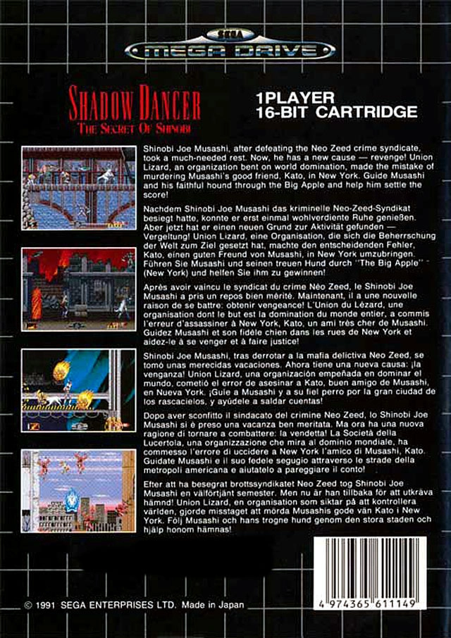 Shadow Dancer : The Secret of Shinobi est un jeu d'action/plates-formes sur Megadrive. L'histoire se déroule à New York en 1997 et le Maître Ninja Shinobi doit faire face à une nouvelle menace. La discrétion et la rapidité sont des armes redoutables mais Shinobi peut aussi utiliser la magie tandis que son chien le protège contre de nombreux assaillants. Chaque niveau se termine par l'affrontement d'un boss et plusieurs bonus peuvent être ramassés en cours de route.