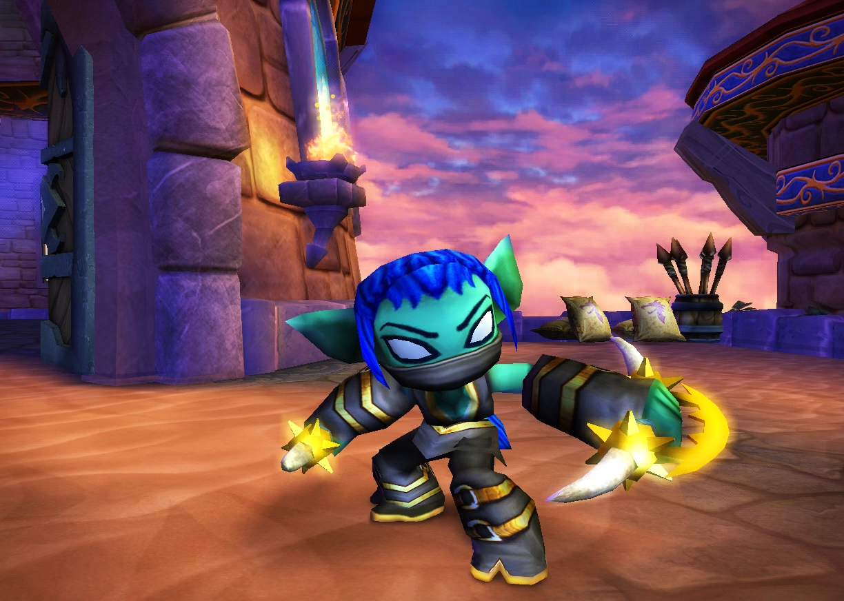 le Skylander Spyro'S Adventure Stealth Elf est une elfe ninja de couleur verte qui porte des vêtements marrons, un foulard de la même couleur qui couvre la moitié de son visage et une paire de crocs qui lui servent de dagues.
