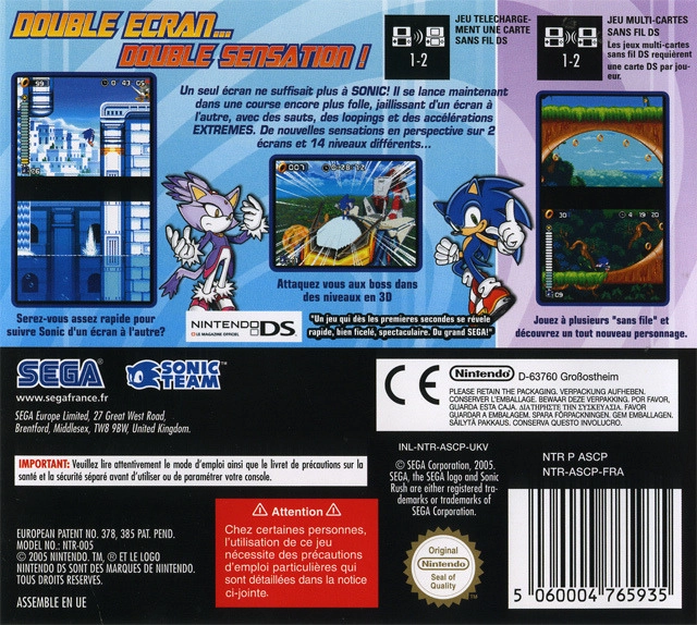 Sonic Rush sur Nintendo DS est un jeu de plates-formes en 2D mettant en scène le célèbre hérisson bleu. Il s'agit d'arpenter des mondes en fonçant à une vitesse folle. Loopings, figures et bonus diversvous attendent, sans parler des boss dans des stages en 3D.