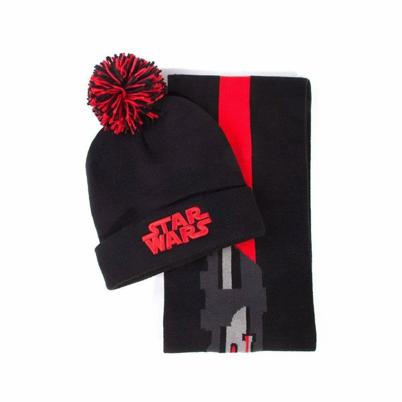 Que la force soit avec vous ! Bonnet classique avec grand pompon et logo brodé. Echarpe en tricot Jaquard inspirée de Star-Wars, parfaite pour l'extérieur.Composition : Bonnet : 100% Acrylique - Echarpe : 95% Acrylique - 5% Elasthanne