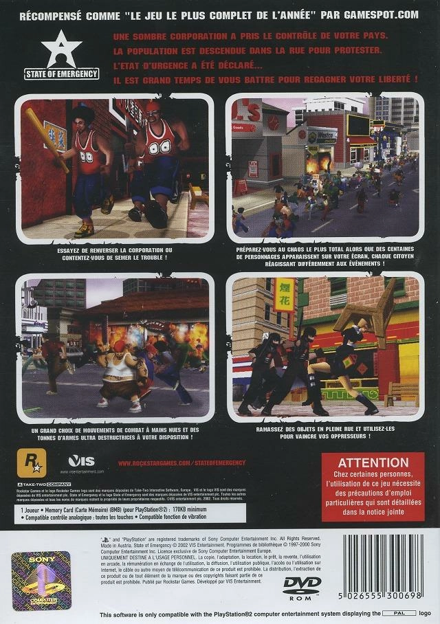 State of Emergency est un jeu d'action sur Playstation 2. Une sombre corporation a pris le contrôle de votre pays et la population est descendue dans la rue pour protester. L'état d'urgence a donc été déclaré.