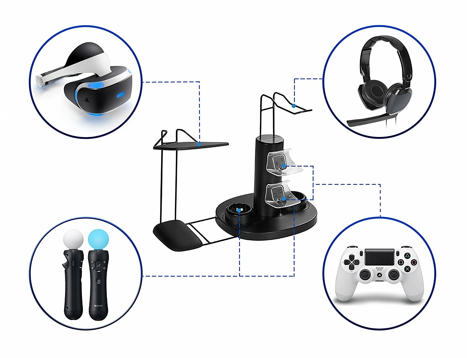 Support pour PS VR, arceau pour casque gaming.Permet de ranger le casque VR, 2 manettes, 2 PS Move et un casque gamer.Recharge de 2 manettes DualShock 4 et de 2 PS Move.