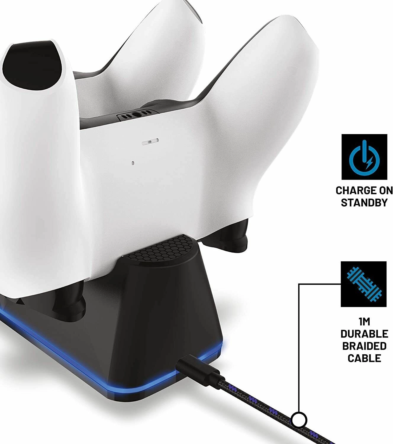 Station de recharge double simple et facile à utiliser pour deux manettes PS5. Il suffit de placer les manettes sur les docks pour qu'elles se chargent, même lorsque la console est en veille.