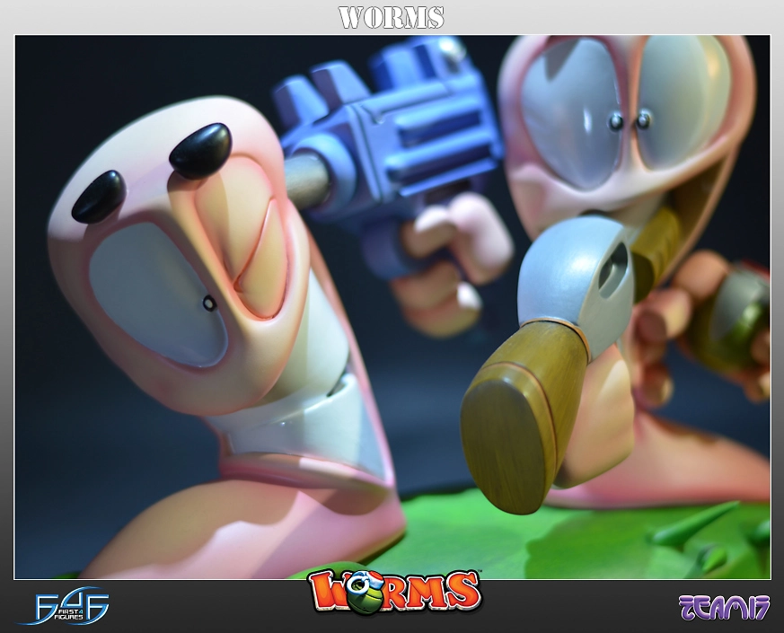 Superbe statue de Worms en résine de qualité finie et peinte à la main taille 25cm sous licence officielle, inspirée du jeu vidéo "Worms 2 Armageddon". Réalisée par First 4 Figures. Édition limitée, numérotée sous le socle et fournie avec certificat d'authenticité.