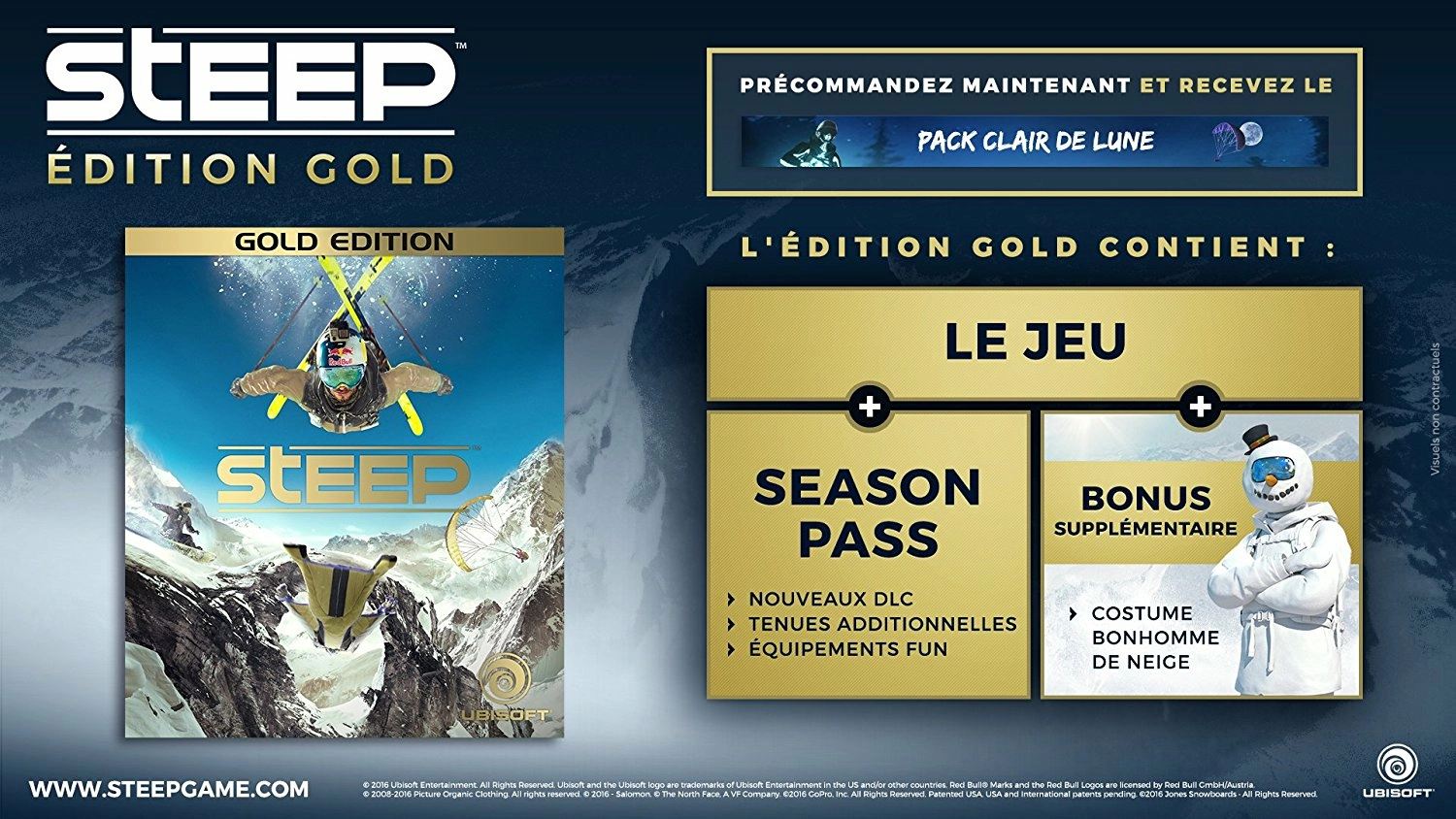 Steep Gold édition sur Xbox One inclus le jeu Steep ainsi qu'un Season Pass et des bonus supplémentaire.