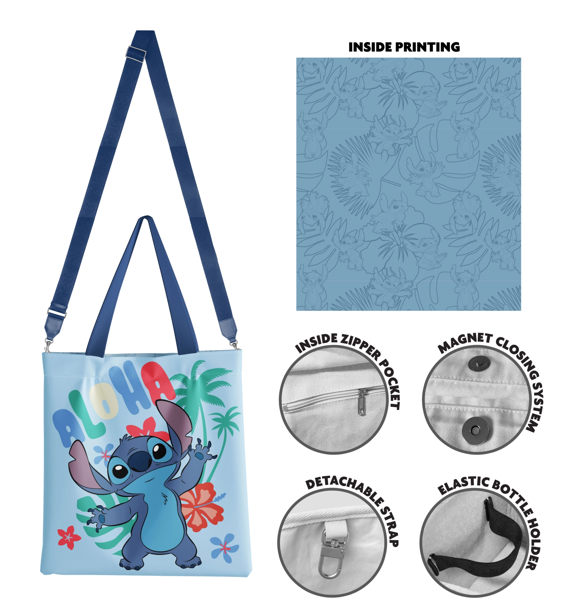 Tote Bag Limited Edition Stitch alohaDimensions : 40X 36cm, Bandoulière en Cotton 10 oz amovible avec mousqueton et ajustable de 60 à 90 cm, Sac en polyester 10 oz, doublure imprimée en Polyester 190T, poche intérieure zippée, fermeture par bouton magnétique, sangle en cotton avec boucle mousqueton de suspension, élastique intérieur pour maintien vertical d'une bouteille ou d'une gourde.