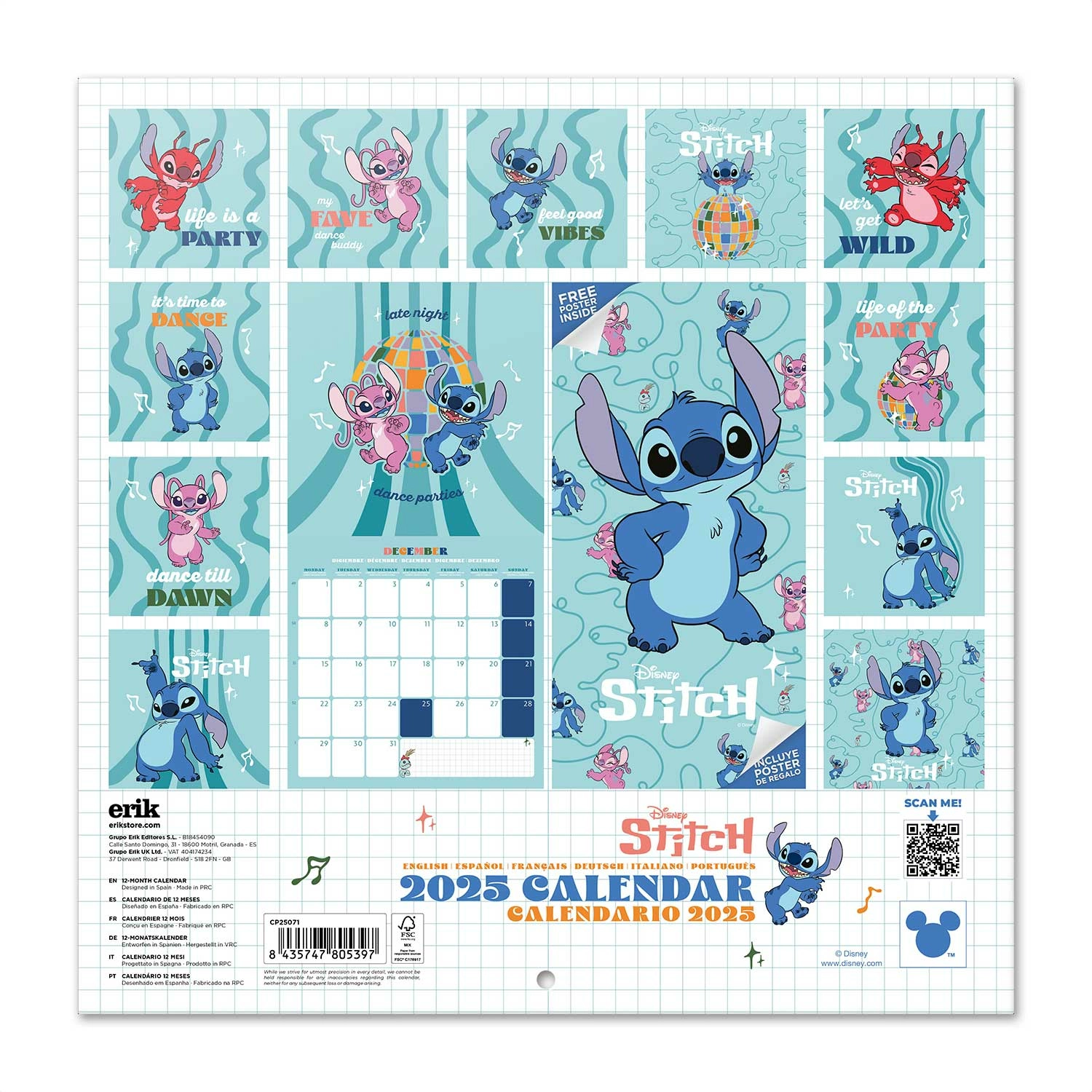 De janvier 2025 à décembre 2025. Dimensions : 29,5 x 29,5 cm : 29,5 x 29,5 cm, reliure agrafée. Contient 12 images et un poster à l'intérieur. Comprend un trou de 5 mm pour la fixation murale. La couverture est en papier couché mat et laminé de 250 g/m², l'intérieur est également en papier couché mat de 128 g/m². Langues : Anglais, espagnol, français, italien, allemand et portugais.Livré dans une enveloppe en carton décoré de 30 x 30 cm, 300 g/m².