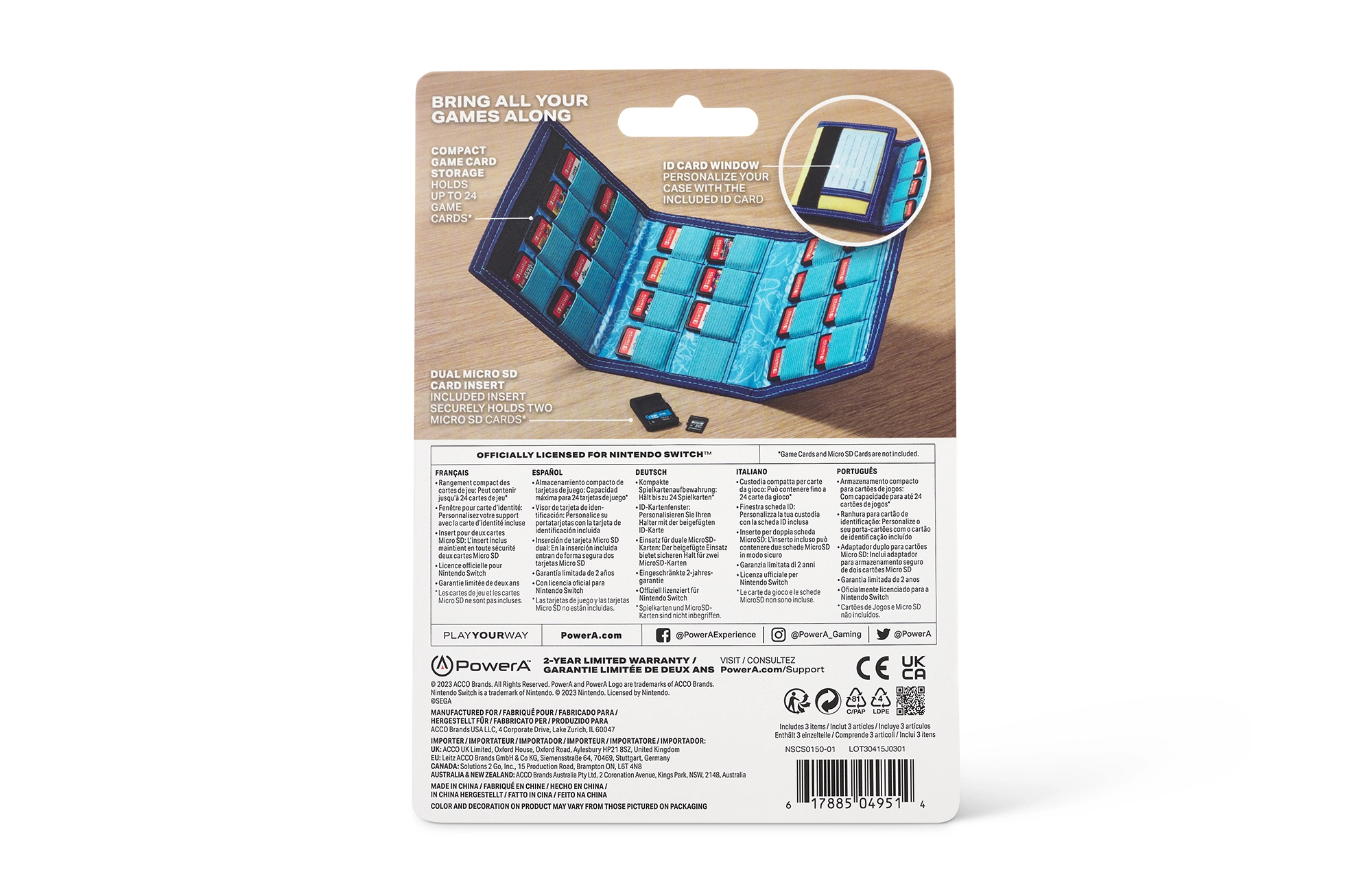Caractéristiques :-Rangement compacte qui tient dans la poche et dans l'étui de protection PowerA.-Peut contenir 24 cartes de jeu*, avec un porte-carte d'identité supplémentaire-Insert pour 2 cartes micro SD grâce à une pièce moulée séparée*. -Licence officielle de Nintendo.*cartes de jeu & Cartes Micro SD ne sont pas incluses.