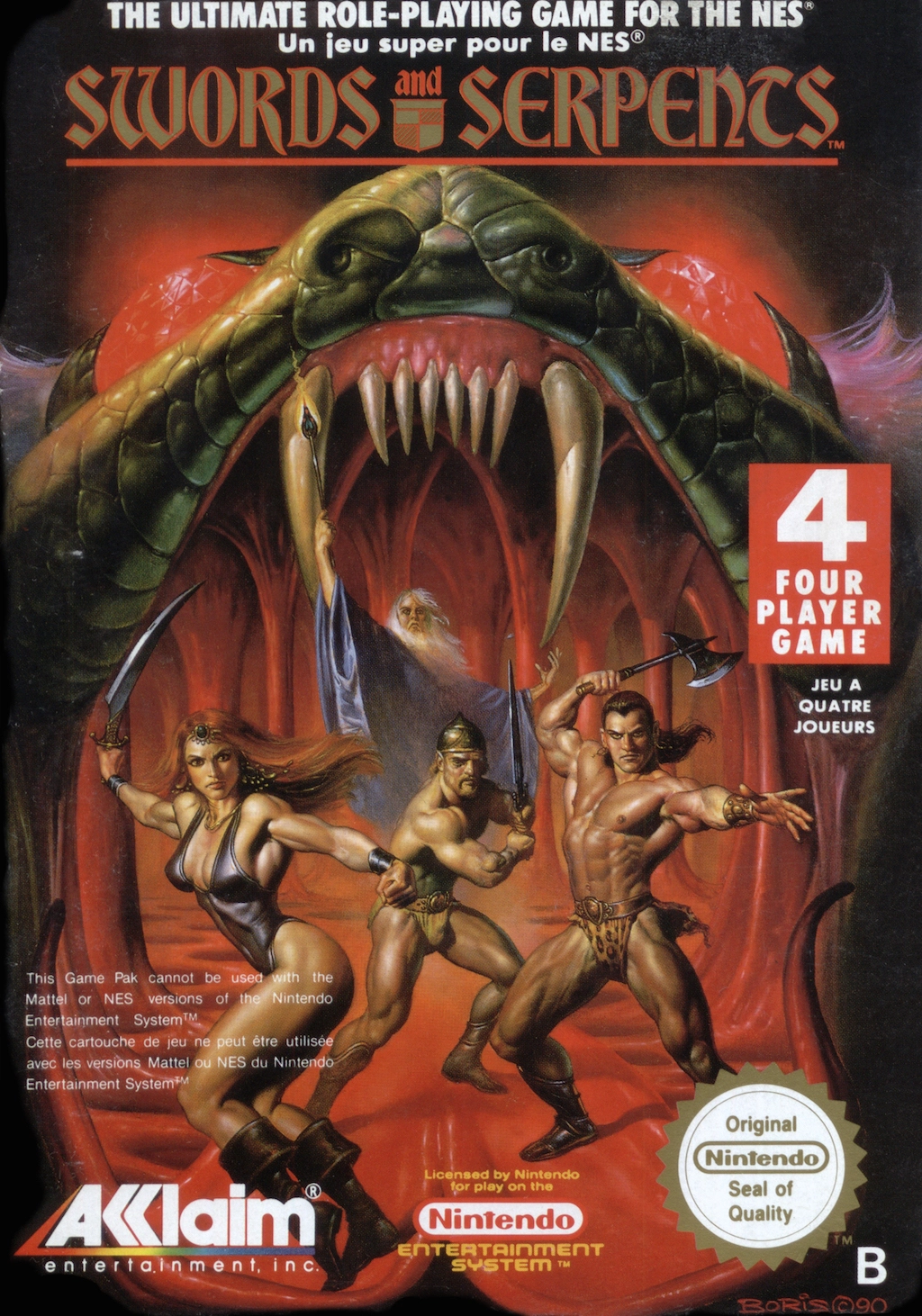 Swords And Serpents est un jeu de rôle sur NES. Dans les profonds donjons reposent des trésors fabuleux. Beaucoup de braves ont essayé de les récupérer, tous ont échoué. Malheureusement pour eux, ils tombèrent nez à nez avec un horrible serpent roi. Est-ce que votre groupe de combattants sera de taille à battre ce monstre et ainsi prendre le fameux trésor qu'il garde ?