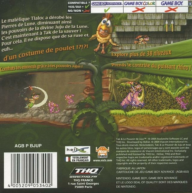 Tak et le Pouvoir de Juju est un jeu de plates-formes disponible sur Game Boy Advance. Une ancienne civilisation se cache dans la forêt loin des hommes modernes. Le joueur prend le contrôle de Tak qui doit sauver la déesse en retrouvant les Pierres de Lune qui ont été dérobées par Tlaloc. Durant son périple, Tak chevauche de puissants rhinocéros pour tout casser et enfilera un étrange costume de poulet.