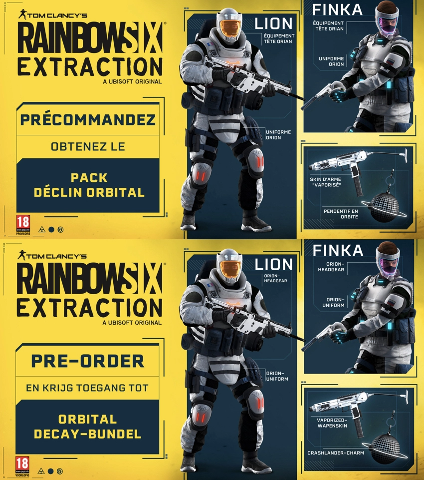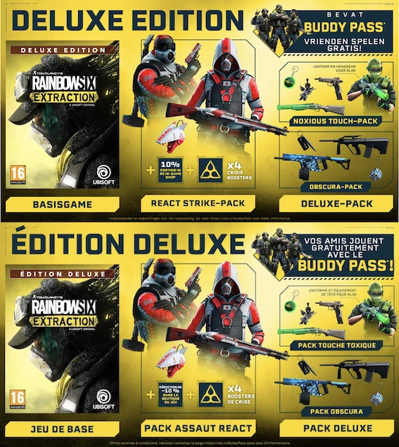 L’Édition Deluxe du jeu inclut :LE JEU · Exemplaire du jeu Rainbow Six Extraction. LE BUDDY PASS*?Avec le Buddy Pass, invitez deux amis à jouer gratuitement avec vous en coop et en ligne pendant une période de 14 jours, quelle que soit leur plateforme et ce, même s’ils ne possèdent pas le jeu !??DES CONTENUS NUMÉRIQUES** · Le PACK ASSAUT REACT inclut l’uniforme, l’équipement de tête et le skin d’arme universel « Spectre », le pendentif « Mâchoire », 4 boosters de crise pour les événements post-lancement ainsi qu’une réduction de -10 % dans la boutique du jeu. · Le Pack Deluxe inclut : o Le Pack Obscura comprenant les skins d’arme universels « Noir mat » et « Brouillage azur » ainsi que les pendentifs « Censuré » et « Anagramme ». o Le Pack Touche toxique comprenant l’uniforme et l’équipement de tête « Touche toxique » (exclusifs à Alibi), les skins d’arme universels « Touche toxique » et « Sauveur » ainsi que les pendentifs « Brise-mâchoire » et « Ange gardien ». Précommandez le jeu pour accéder au pack bonus « Déclin orbital ». Ce pack inclut l’uniforme et l’équipement de tête « Orion » (ne pouvant être appliqués qu’à Finka et Lion), le skin d’arme universel « Vaporisé » ainsi que le pendentif « En orbite ». *Buddy Pass = Pass Ami. Chaque exemplaire du jeu vous permet d'inviter 2 amis Ubisoft à rejoindre vos sessions en ligne et à jouer dans votre équipe pendant une période de 14 jours. Version d'essai actuellement disponible uniquement sur PlayStation, Xbox et PC. Offre et dates susceptibles d'être modifiées. Des restrictions s'appliquent, notamment en matière de disponibilité, de technique et de contenu. Les fonctionnalités du Buddy Pass peuvent varier. Non applicable en cas d'interdiction. Plus d'informations ici : https://ubi.li/BuddyPass