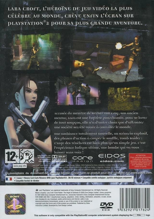 Tomb Raider L'Ange des Ténèbres est un jeu d'action/plates-formes sur Playstation 2. Accusée du meurtre de Werner Von Croy, son ancien mentor, Lara est une fugitive pourchassée.