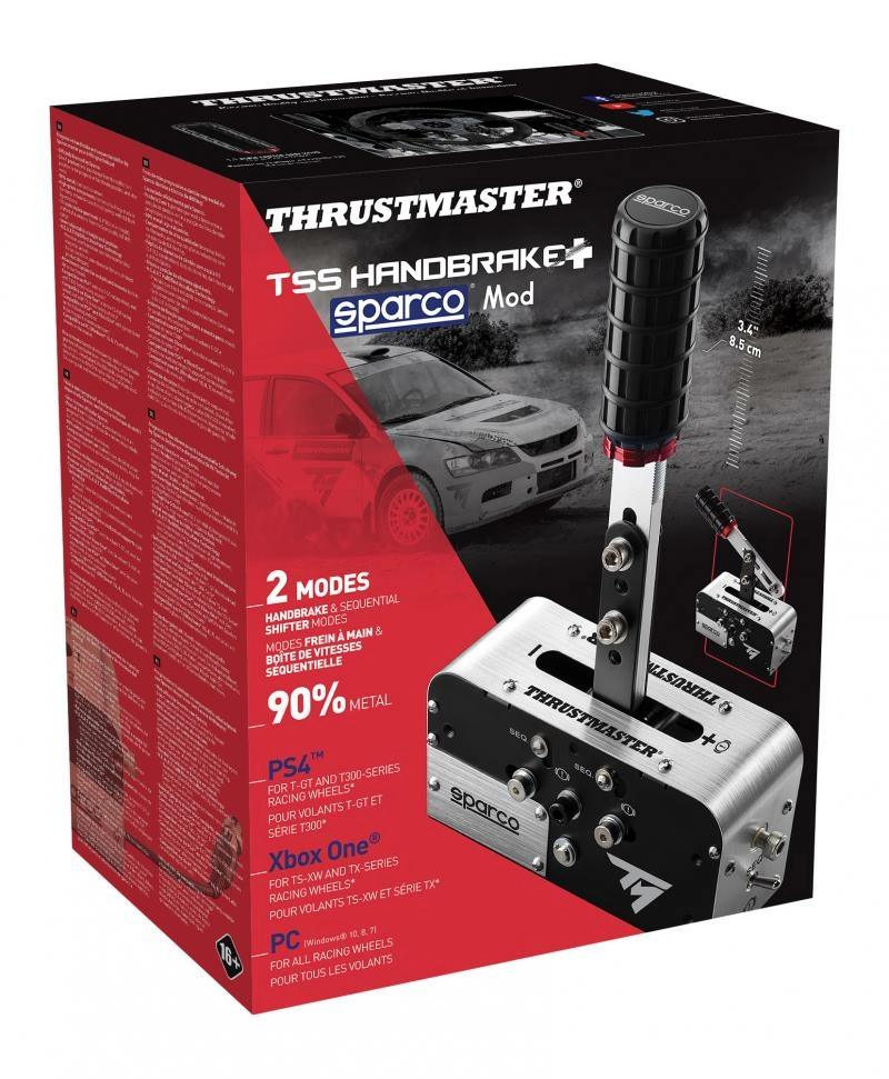 - Le TSS HANDBRAKE Sparco Mod + est un produit 2-en-1 qui présente deux modes : un mode frein à main progressif, et un mode boîte de vitesses séquentielle. Compatible sur consoles avec les bases de volants T-GT ou T300-Series sur PS4* et avec les bases volants TS-XW Racer et TX-Series sur Xbox One*, le TSS HANDBRAKE Sparco Mod + est aussi compatible sur PC avec tous les volants disponibles sur le marché. Ce nouvel accessoire Thrustmaster se positionne comme l’accessoire indispensable pour une simulation racing optimale sur consoles et PC.