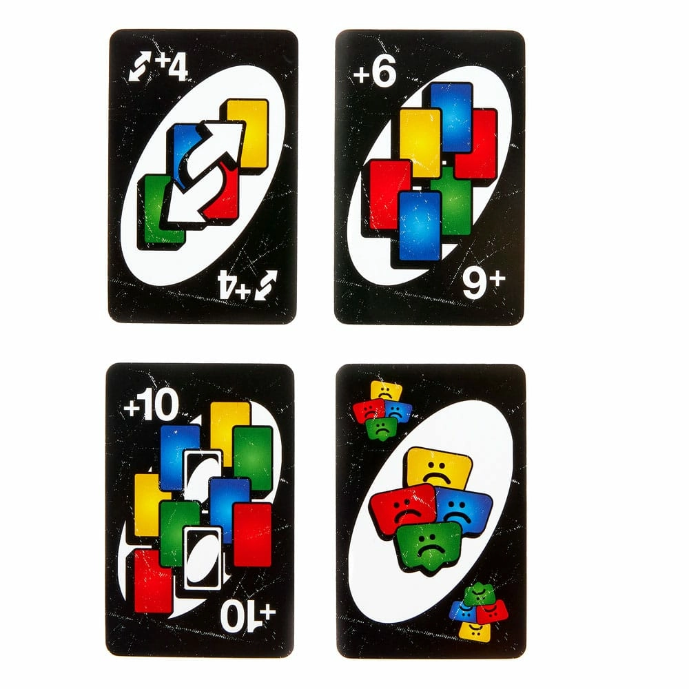 UNO No Mercy est notre jeu UNO le plus brutal à ce jour ! Il contient encore plus de cartes avec des pénalités BIEN plus sévères (quelqu’un veut piocher 10 cartes ?) et des nouvelles règles qui feront piocher, échanger et accumuler plus que jamais des cartes aux joueurs !