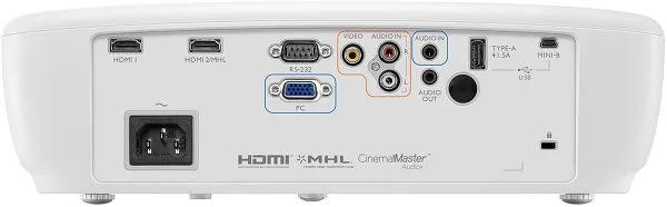 La connectique du vidéoprojecteur BenQ W1090 comprend deux entrées HDMI 1.4, afin de brancher un lecteur Blu-ray et une console de jeux par exemple. Notez par ailleurs que la seconde entrée HDMI est compatible MHL, ce qui permet de lui connecter un smartphone ou une tablette compatible pour en afficher les images sur grand écran. Une entrée vidéo RVB composantes sur connecteur VGA 15 broches est également de la partie, ainsi qu'une entrée vidéo composite et deux entrées audio (RCA et mini-jack). Bien qu'anecdotique, la section audio constituée d'un haut-parleur mono intégré et d'un amplificateur de 10 W permet toutefois de se passer ponctuellement d'un système audio externe. Enfin, le port USB peut servir à alimenter un récepteur HDMI sans fil comme le BenQ Q Cast (DLNA, Miracast) ou un transmetteur audio-vidéo HDMI sans fil comme le BenQ WDP02.