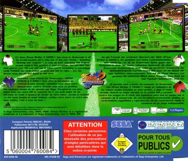 Virtua Striker 2 Ver 2000.1 sur Dreamcast est une simulation de football proposant de commander une trentaine d'équipes nationales provenant des quatre coins du globe. Trois modes de jeu sont proposés (match amical, coupe et championnat) et on peut également créer sa propre coupe comprenant jusqu'à 32 équipes.