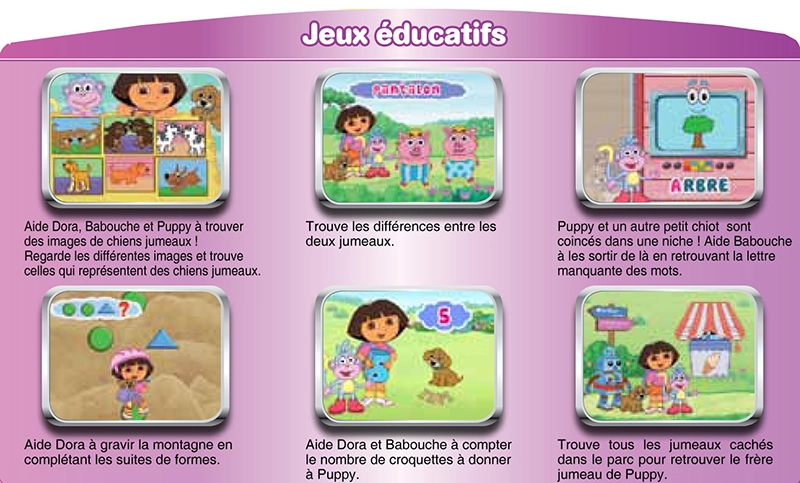 Sur la route qui les mène à la fête des jumeaux, Dora et Babouche devront traverser 6 univers différents où ils pourront avec toi exercer leur sens de l’observation, leur logique, apprendre à compter et découvrir des mots.